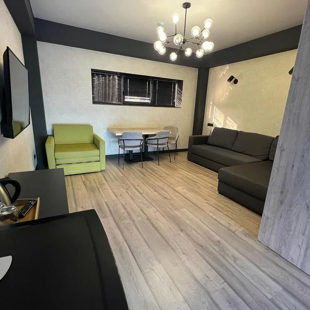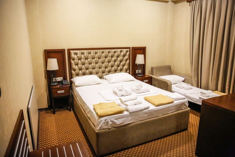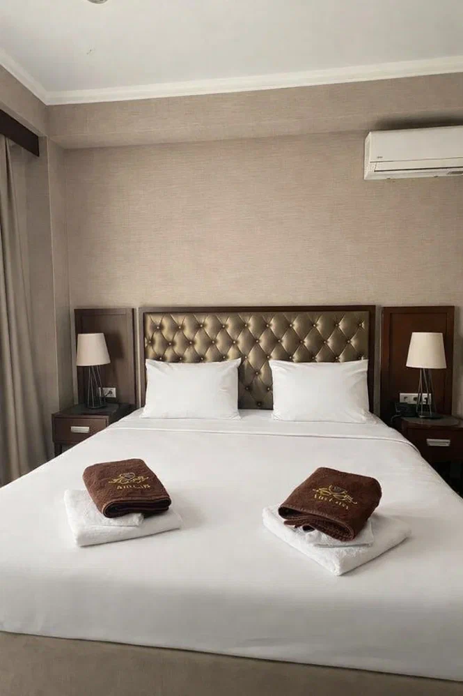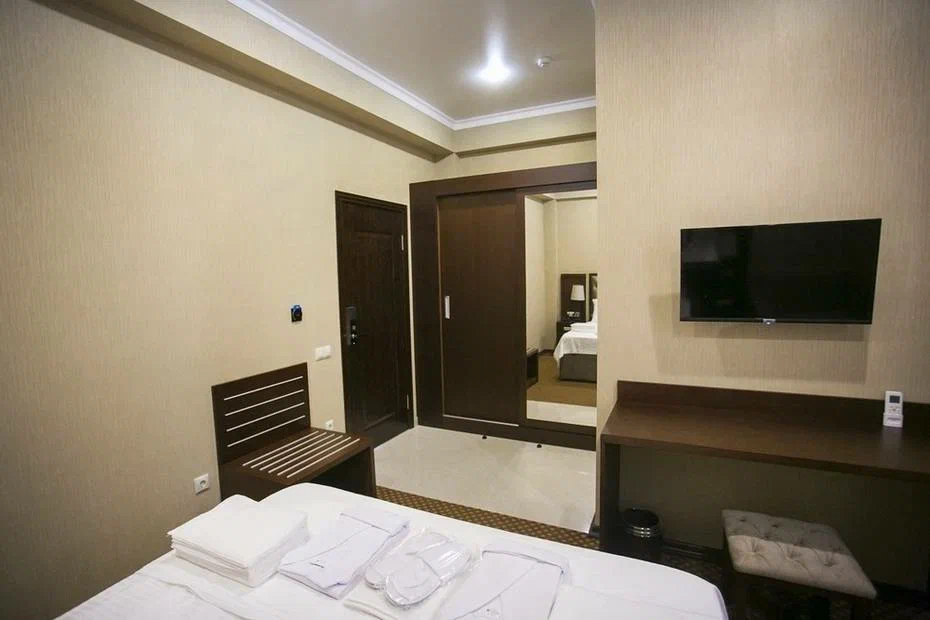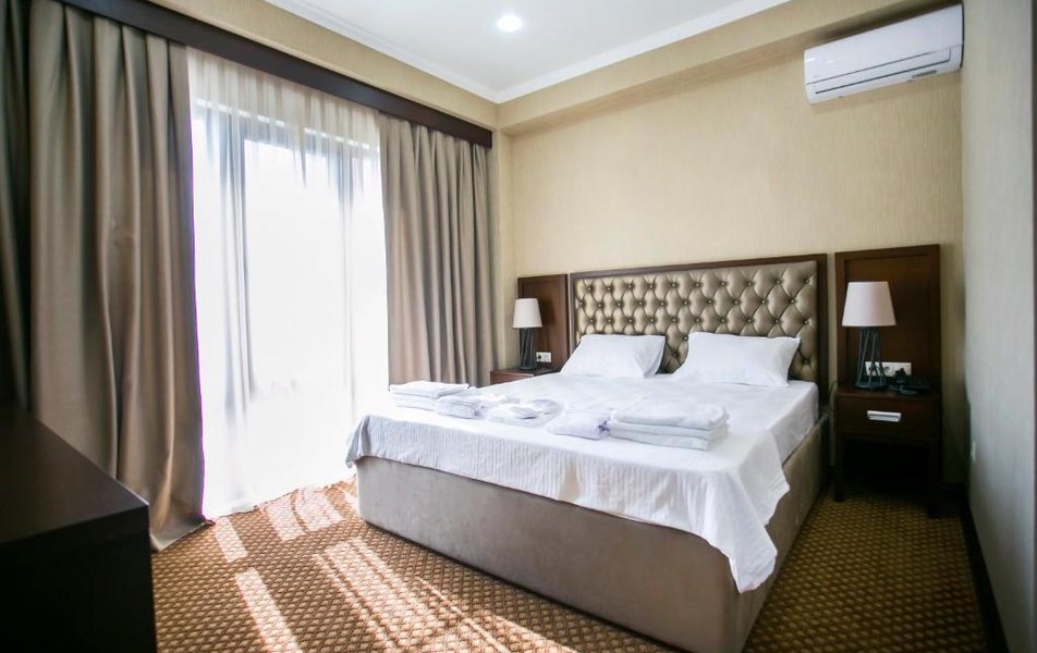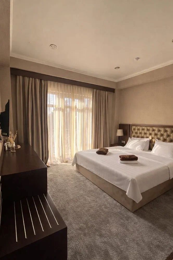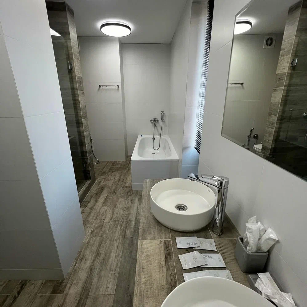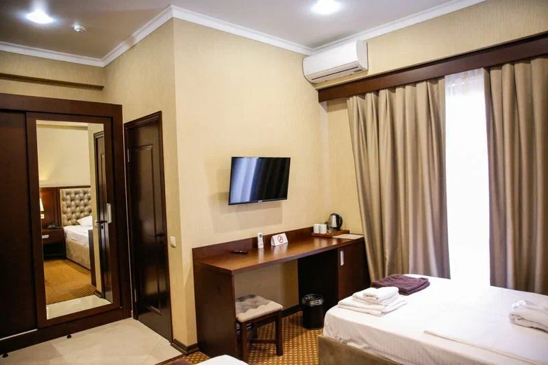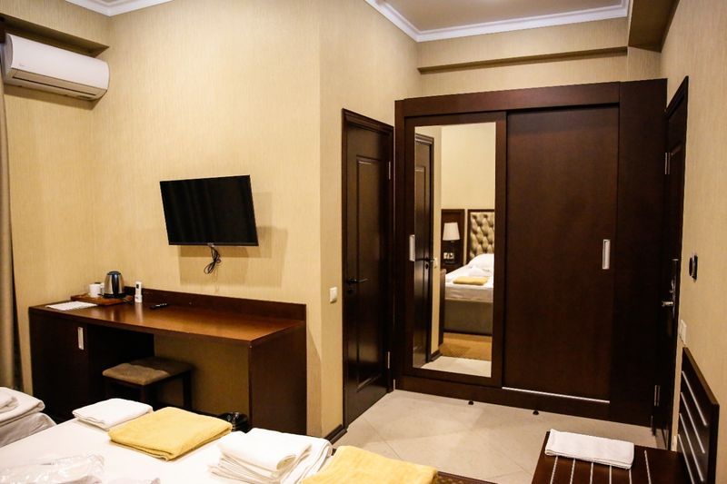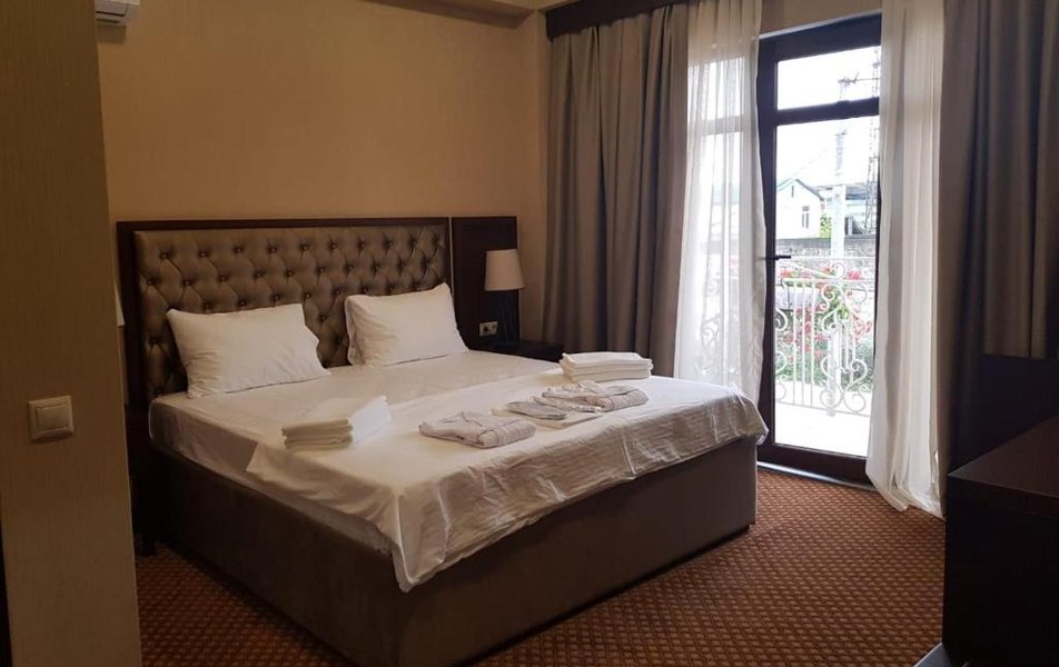 Город Сухум в это время года нам очень не понравился и мы почти уехали из него, но в последний момент решили переночевать, выбор пал на данный отель. Он нас поразил и приятно удивил. Для начало стоимость номера в 4-звездочном отеле (2210₽), во вторых На грустной серой улице стоял хорошо отремонтированный дом, высокий, красивый, встретили нас двое мужчин (нас это немного смутило), но все остальное было очень даже на высоте. Мужчины оказались сотрудниками (администратор и охранник), были очень вежливы и обходительны. Заселили нас быстро, рассчитали с помощью карты (что редкость для здешних мест), угостили вином и фруктами, отвечали на наши вопросы, поддерживали беседу, мы были приятно удивлены. Теперь об отеле. Очень и очень хорошего (прекрасного) уровня отель, почти соответствует заявленным 4 звёздам. Есть не большие недочеты, но только потому что отель ещё достраивается (3 и 4 этажи ещё не запустили). Просторный холл, коридоры и лестница сделаны очень достойно. Материалы хорошо подобраны, чувствуется рука дизайнера. Номера очень чистые и прекрасно оформлены, выдержаны в едином стиле, выглядят дорого и богато. Шикарно подобранна цветовая гамма отделки, текстиля, мебели. Шторы вообще огонь, хорошая современная бытовая техника, современный санузел, в номере есть все необходимое. Кондиционер, обогреватель, чайные принадлежности, мини-бар, телевизор, Wi-Fi, шикарный матрас, дополнительные подушки и одеяло, белоснежное белье, халаты. Добавим ложку дёгтя в эту бочку с мёдом. В номерах нет бесплатной, бутилированной воды. И для отеля такого уровня экономить на туалетной бумаге не допустимо (однослойная и дешевая). Подводя итог можно сказать. Этот отель очень достойный представитель отельного фонда города Сухум. Рекомендую к посещению, отличное соотношение цены и качества. Хочется сказать собственникам большое спасибо, за место (созданное ими) которое дарит радость.