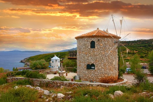 Санторини расположен в Эгейском море, недалеко от острова Крит, и климат там похож на «соседский»: очень жаркое лето (вплоть до 45 градусов) и ветреная, прохладная зима. На острове находится вулкан Санторин, в последние годы, к счастью, уснувший, и пляжи покрывает чёрный, лавовый песок. Зелени там мало, правда, местные фермеры выращивают сладкие помидоры «черри» и крупные фисташки.