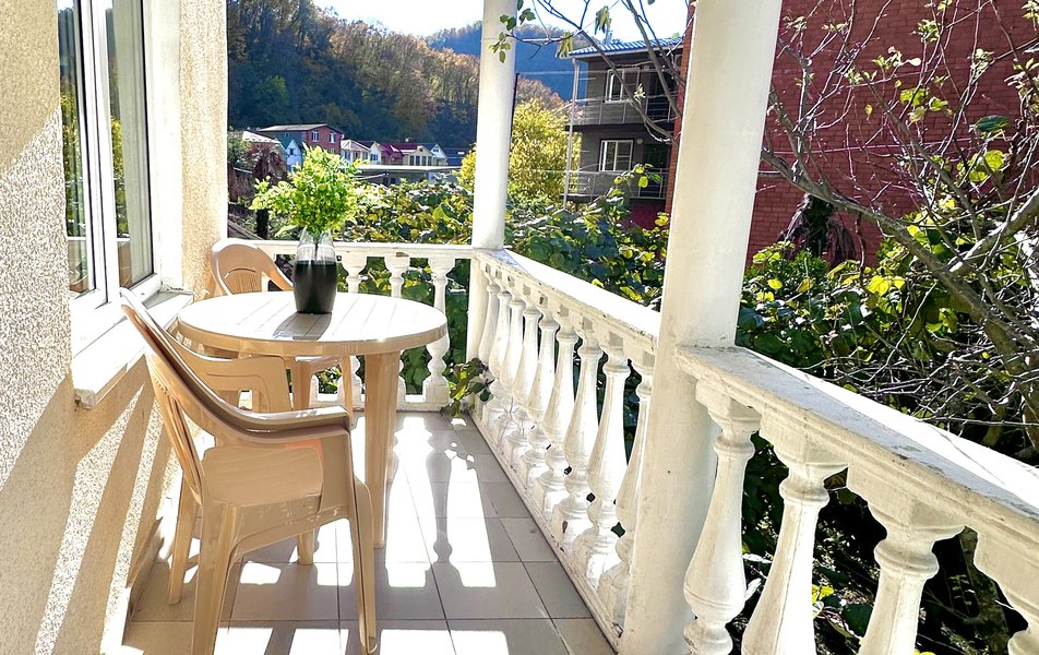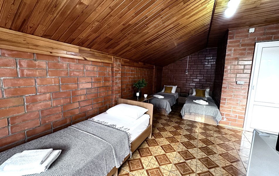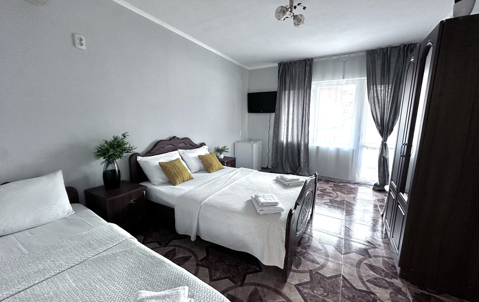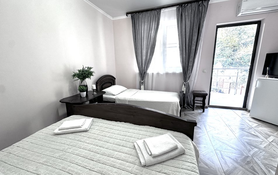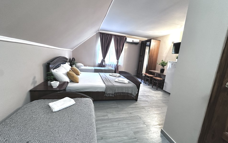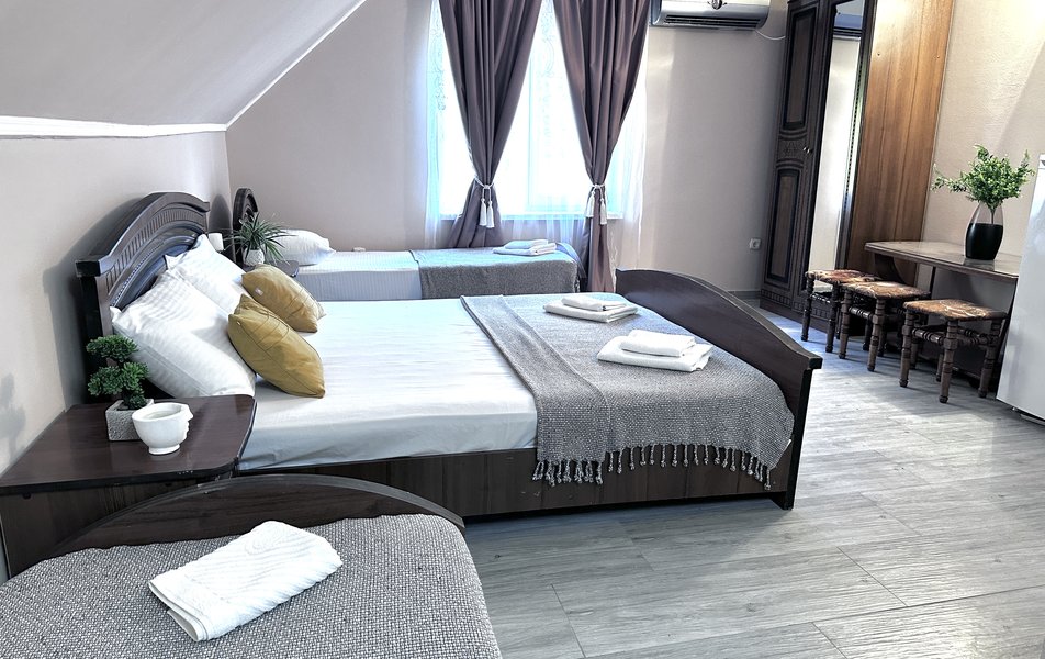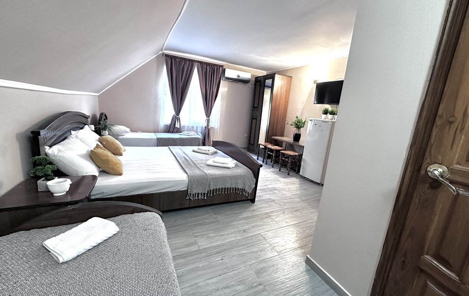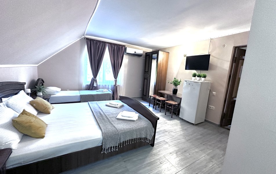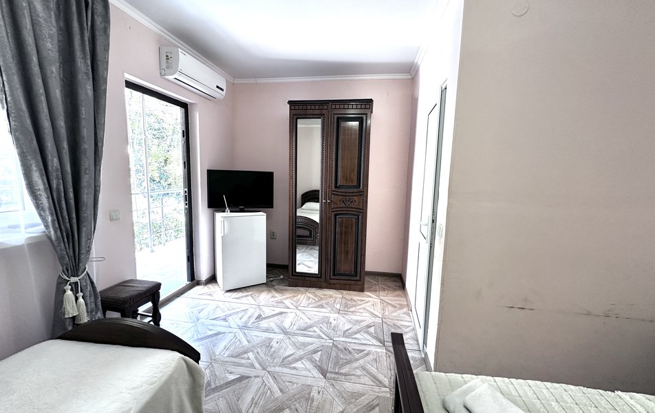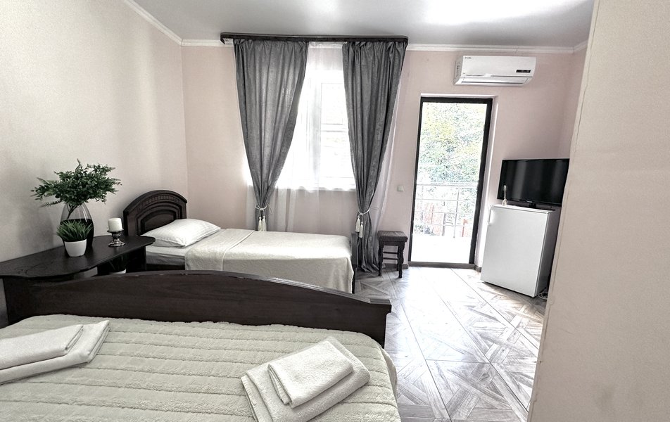 Отдыхали 2 взрослых и 2 ребёнка, на 7 ночей. Бронировали номер в коттедже, кажется семейный. Администратор приветливая и вежливая девушка. Номер просторный: при входе холл большой, стоит стол и 4 стула, так же холодильник с морозильной камерой. Далее две комнаты. В детской шкаф без полок, поэтому он был просто бесполезный. Повесить на 5 вешалок все детские вещи невозможно, поэтому шкафом в детской пользоваться не смогли. Так же есть собственный балкон, стол и два стула. В каждой комнате по телевизору, но показывает всего 3 канала, поэтому пользоваться ими к сожалению не удалось. Ремонт, конечно, старый. Прям вернулись в начало 2000ых. Свет в комнате не работал, пользовались ночником, он яркий и спасал ситуацию. Комнаты предполагалась закрывались на замки и были даже ключи от двух комнат, но по факту замки не работают. Кстати ключ от номера у нас забрала женщина в первый же день приезда, сделать копию для персонала и до конца отдыха не вернули, то есть в наше отсутствие наше жильё всегда было открыто. И самое ужасное, что во время отъезда с нас спрашивали эти ключи и НЕ верили нам, что кто-то из сотрудников забрал у нас, чтобы копию сделать, т.к. до этого их кто-то потерял. Обязательно берите с собой туалетку, мыло, половую тряпку, средство для мытья посуды, если планируете готовить и питаться самостоятельно. За неделю не меняли бельё, полотенца и не убирались. Далее по территории: она маленькая, но всё в зелени - это радует. Есть бассейн, но он холодный и глубокий. До моря минут 10-15 кто как ходит) нас не напрягала дорога. Кстати, на территории висит реклама экскурсий, ни в коем случае не берите там, нас обманули!!! Обещали поездку на 33 водопада чайные плантации купание в горной реке. По факту возили по дегустациям каньон прохладный, то есть вместо 3ех локаций отвезли только в одну! Когда мы написали этому Артёму, почему мы бронировали одну экскурсию, а получили совершенно другую, он ответил "уточню" и просто пропал. Это мошенники! Не знаю как они могли у себя на территории отеля повесить рекламу людей, которые обманывают туристов!