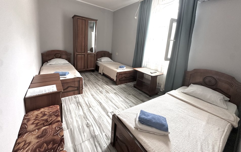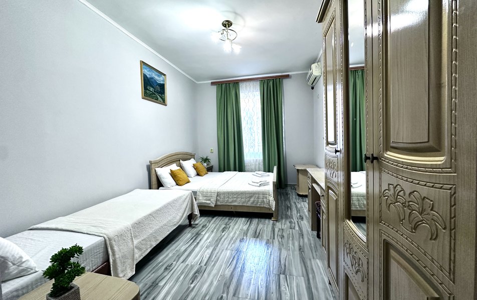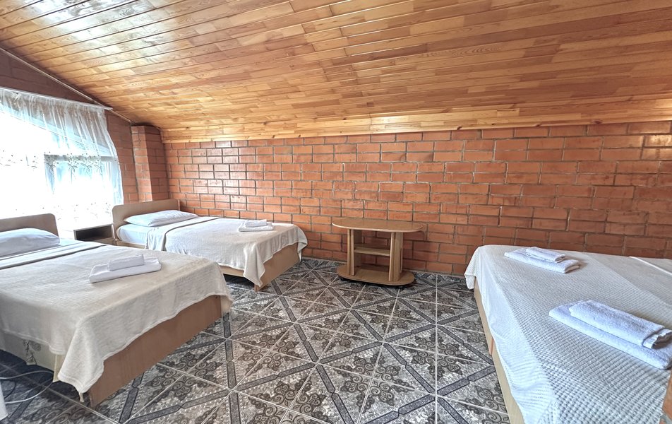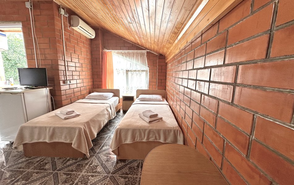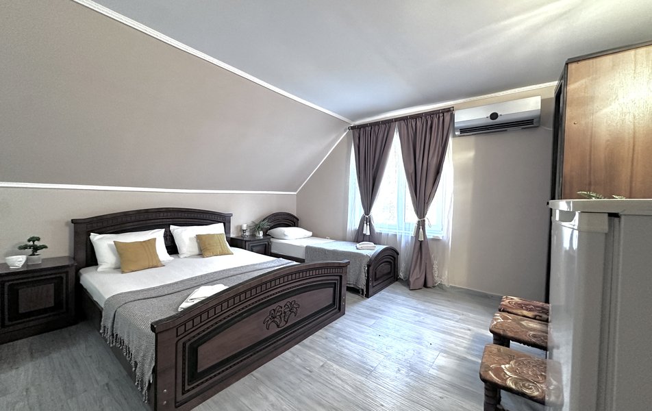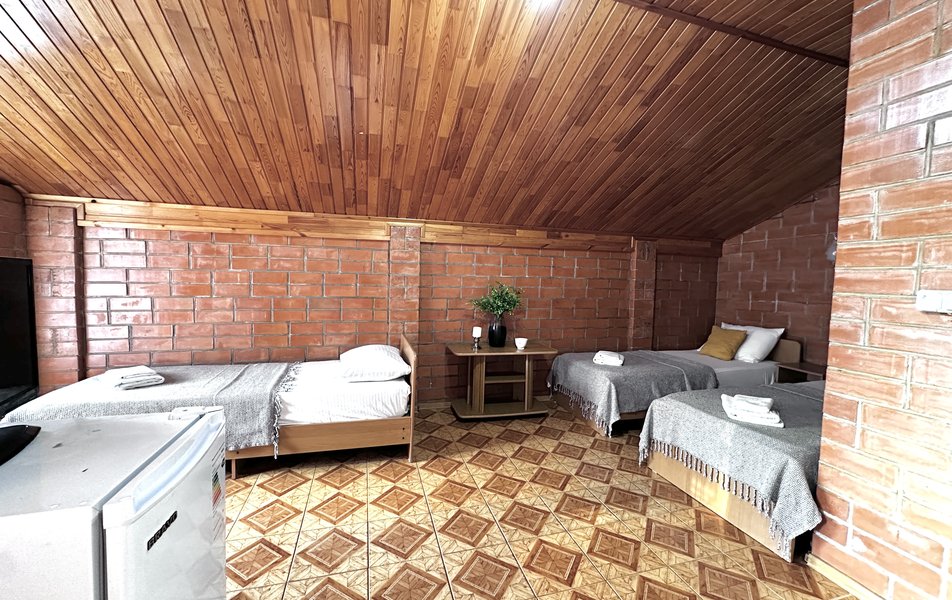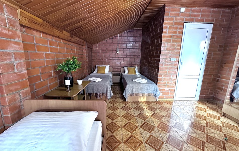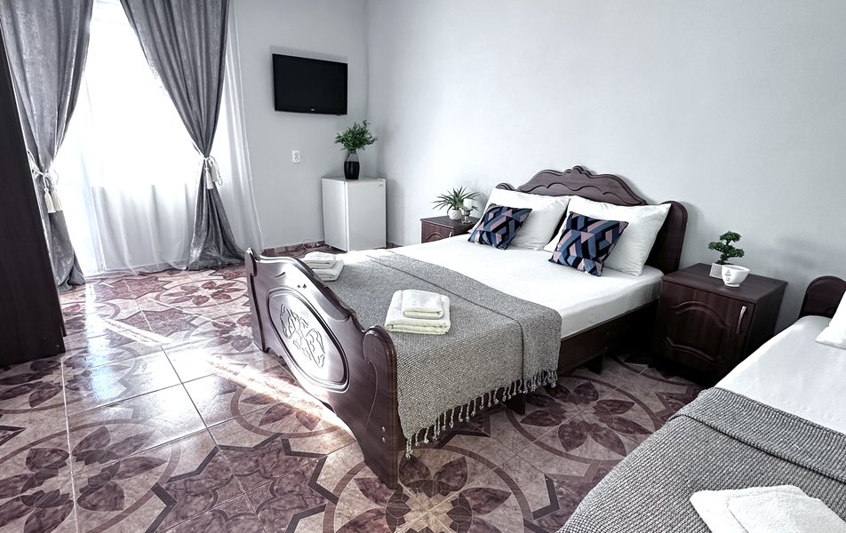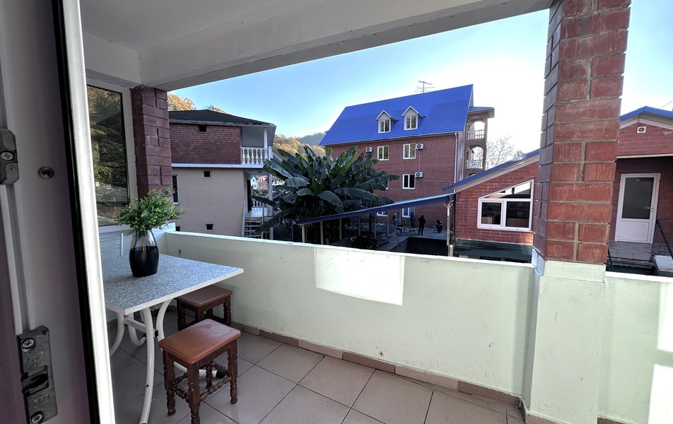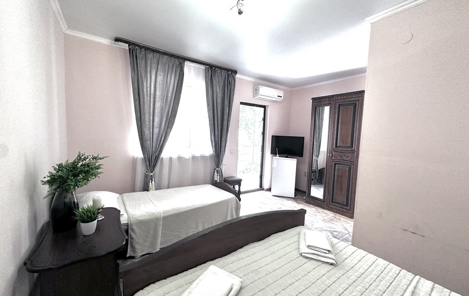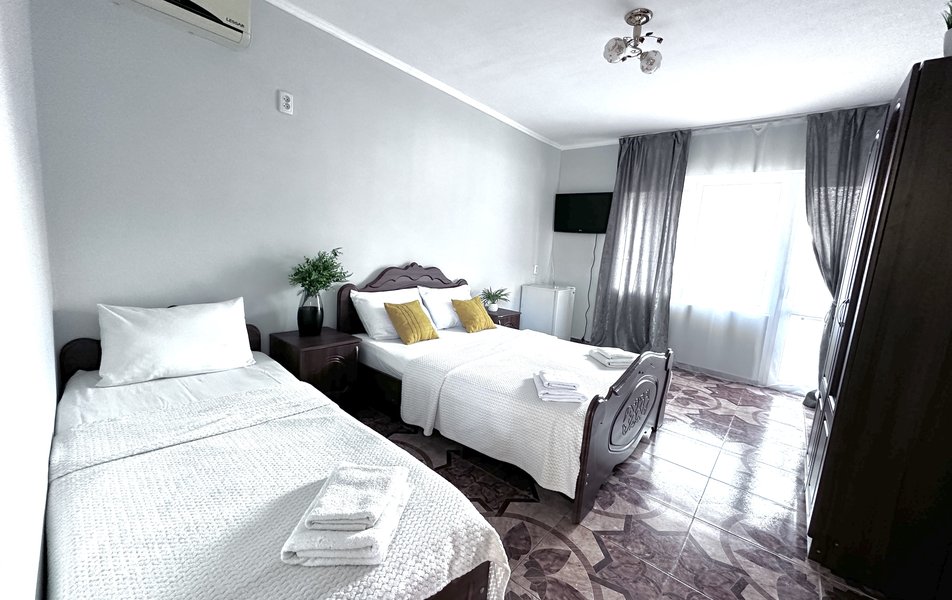 Отдыхали 2 взрослых и 2 ребёнка, на 7 ночей. Бронировали номер в коттедже, кажется семейный. Администратор приветливая и вежливая девушка. Номер просторный: при входе холл большой, стоит стол и 4 стула, так же холодильник с морозильной камерой. Далее две комнаты. В детской шкаф без полок, поэтому он был просто бесполезный. Повесить на 5 вешалок все детские вещи невозможно, поэтому шкафом в детской пользоваться не смогли. Так же есть собственный балкон, стол и два стула. В каждой комнате по телевизору, но показывает всего 3 канала, поэтому пользоваться ими к сожалению не удалось. Ремонт, конечно, старый. Прям вернулись в начало 2000ых. Свет в комнате не работал, пользовались ночником, он яркий и спасал ситуацию. Комнаты предполагалась закрывались на замки и были даже ключи от двух комнат, но по факту замки не работают. Кстати ключ от номера у нас забрала женщина в первый же день приезда, сделать копию для персонала и до конца отдыха не вернули, то есть в наше отсутствие наше жильё всегда было открыто. И самое ужасное, что во время отъезда с нас спрашивали эти ключи и НЕ верили нам, что кто-то из сотрудников забрал у нас, чтобы копию сделать, т.к. до этого их кто-то потерял. Обязательно берите с собой туалетку, мыло, половую тряпку, средство для мытья посуды, если планируете готовить и питаться самостоятельно. За неделю не меняли бельё, полотенца и не убирались. Далее по территории: она маленькая, но всё в зелени - это радует. Есть бассейн, но он холодный и глубокий. До моря минут 10-15 кто как ходит) нас не напрягала дорога. Кстати, на территории висит реклама экскурсий, ни в коем случае не берите там, нас обманули!!! Обещали поездку на 33 водопада чайные плантации купание в горной реке. По факту возили по дегустациям каньон прохладный, то есть вместо 3ех локаций отвезли только в одну! Когда мы написали этому Артёму, почему мы бронировали одну экскурсию, а получили совершенно другую, он ответил "уточню" и просто пропал. Это мошенники! Не знаю как они могли у себя на территории отеля повесить рекламу людей, которые обманывают туристов!