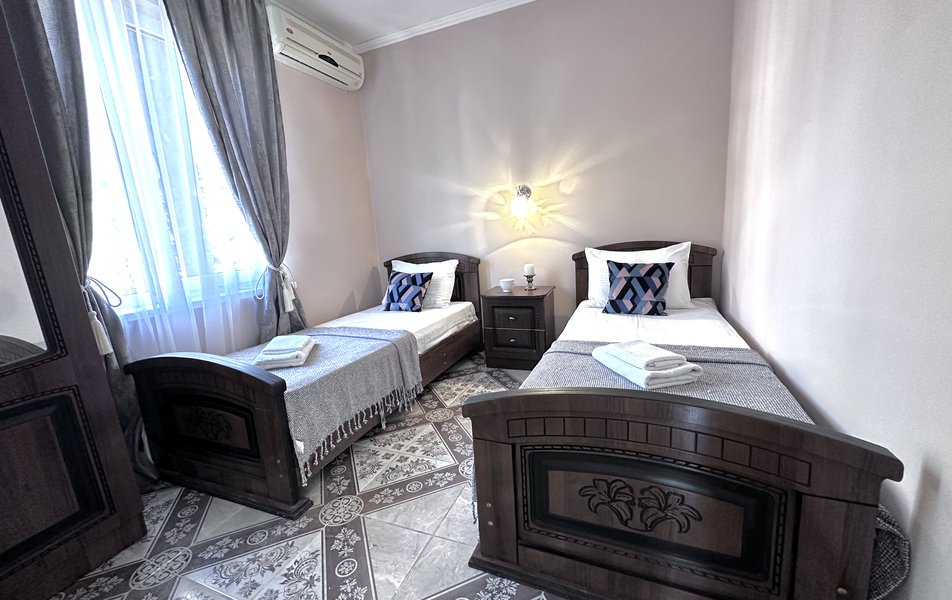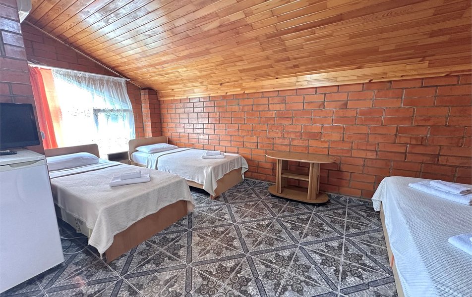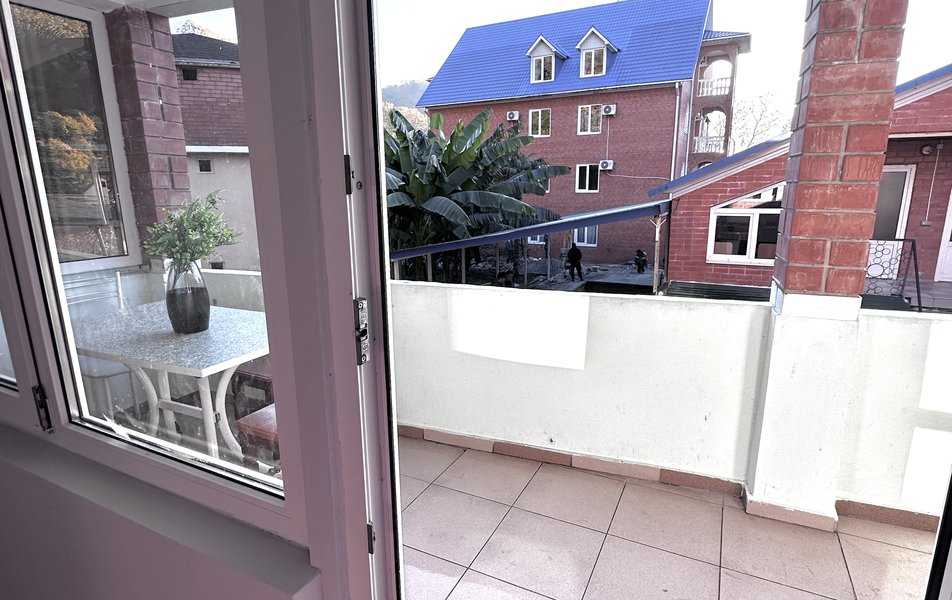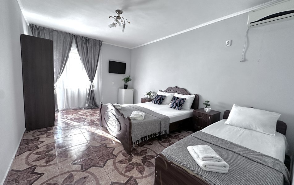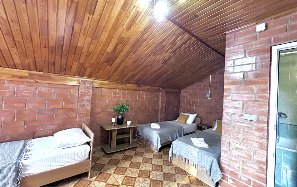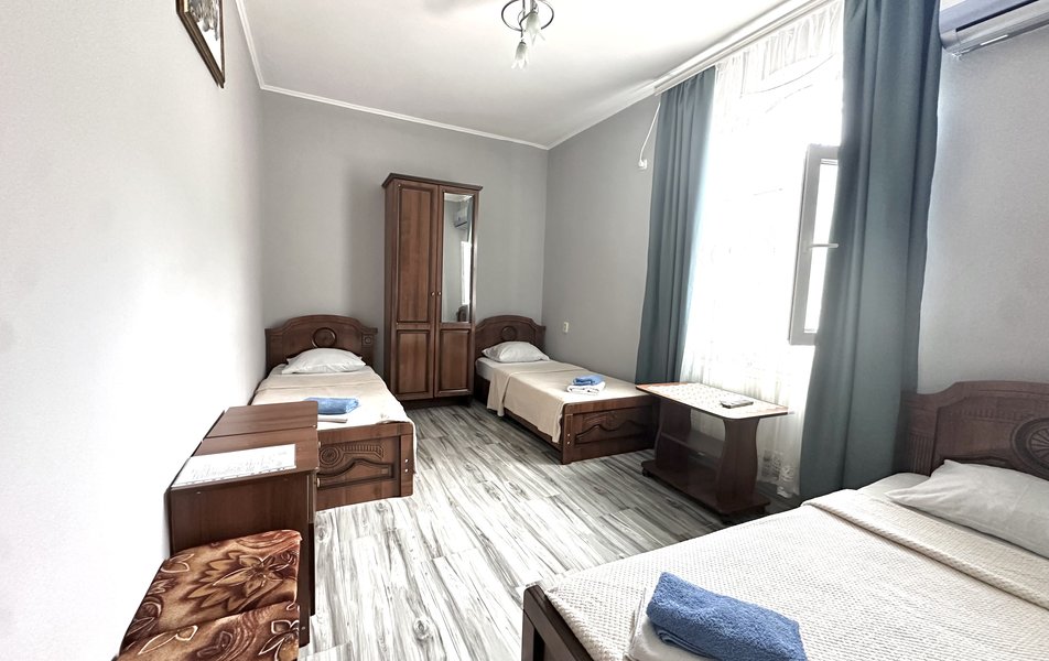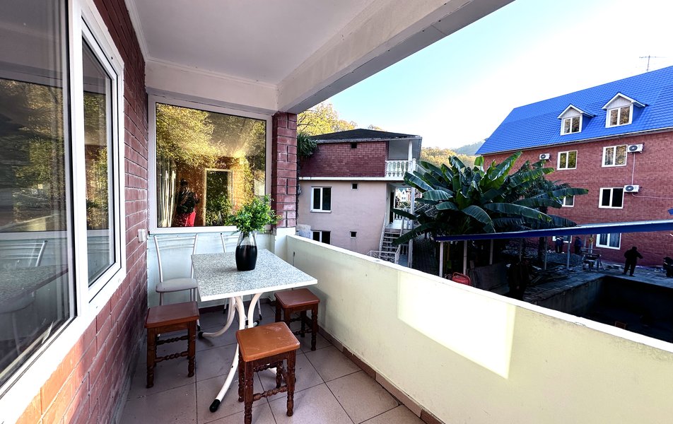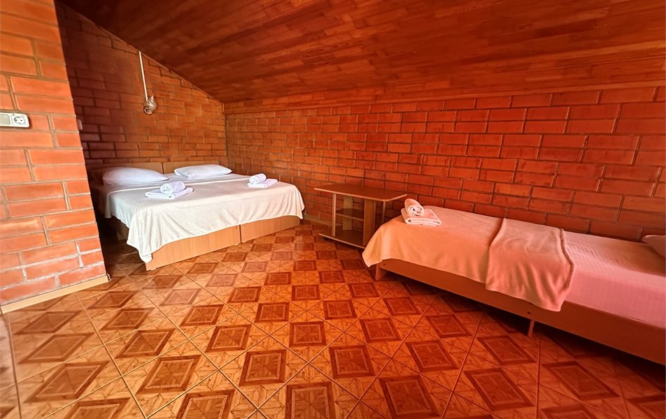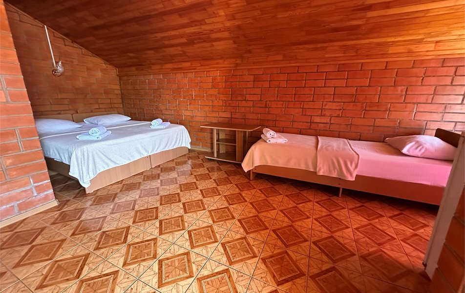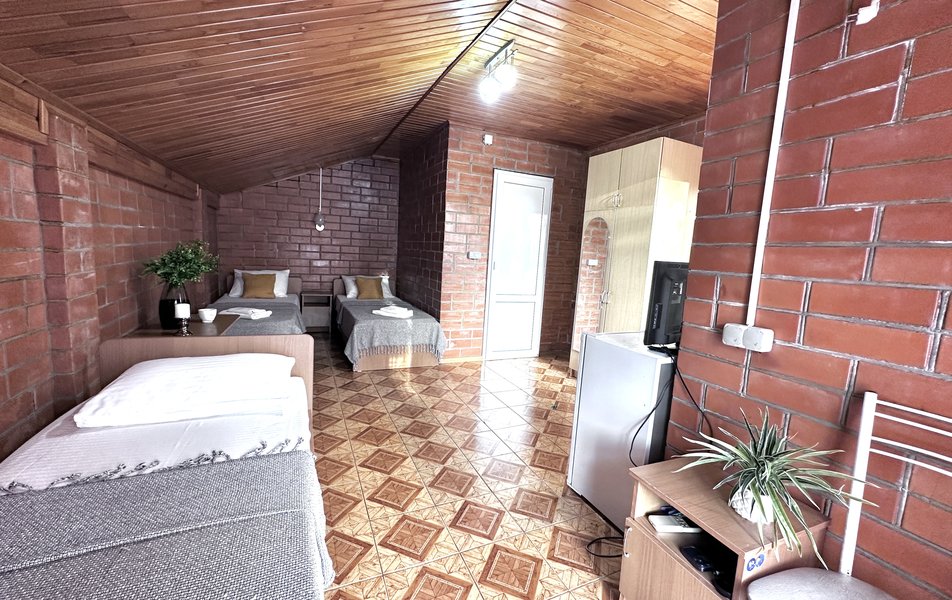 Отдыхали 2 взрослых и 2 ребёнка, на 7 ночей. Бронировали номер в коттедже, кажется семейный. Администратор приветливая и вежливая девушка. Номер просторный: при входе холл большой, стоит стол и 4 стула, так же холодильник с морозильной камерой. Далее две комнаты. В детской шкаф без полок, поэтому он был просто бесполезный. Повесить на 5 вешалок все детские вещи невозможно, поэтому шкафом в детской пользоваться не смогли. Так же есть собственный балкон, стол и два стула. В каждой комнате по телевизору, но показывает всего 3 канала, поэтому пользоваться ими к сожалению не удалось. Ремонт, конечно, старый. Прям вернулись в начало 2000ых. Свет в комнате не работал, пользовались ночником, он яркий и спасал ситуацию. Комнаты предполагалась закрывались на замки и были даже ключи от двух комнат, но по факту замки не работают. Кстати ключ от номера у нас забрала женщина в первый же день приезда, сделать копию для персонала и до конца отдыха не вернули, то есть в наше отсутствие наше жильё всегда было открыто. И самое ужасное, что во время отъезда с нас спрашивали эти ключи и НЕ верили нам, что кто-то из сотрудников забрал у нас, чтобы копию сделать, т.к. до этого их кто-то потерял. Обязательно берите с собой туалетку, мыло, половую тряпку, средство для мытья посуды, если планируете готовить и питаться самостоятельно. За неделю не меняли бельё, полотенца и не убирались. Далее по территории: она маленькая, но всё в зелени - это радует. Есть бассейн, но он холодный и глубокий. До моря минут 10-15 кто как ходит) нас не напрягала дорога. Кстати, на территории висит реклама экскурсий, ни в коем случае не берите там, нас обманули!!! Обещали поездку на 33 водопада чайные плантации купание в горной реке. По факту возили по дегустациям каньон прохладный, то есть вместо 3ех локаций отвезли только в одну! Когда мы написали этому Артёму, почему мы бронировали одну экскурсию, а получили совершенно другую, он ответил "уточню" и просто пропал. Это мошенники! Не знаю как они могли у себя на территории отеля повесить рекламу людей, которые обманывают туристов!