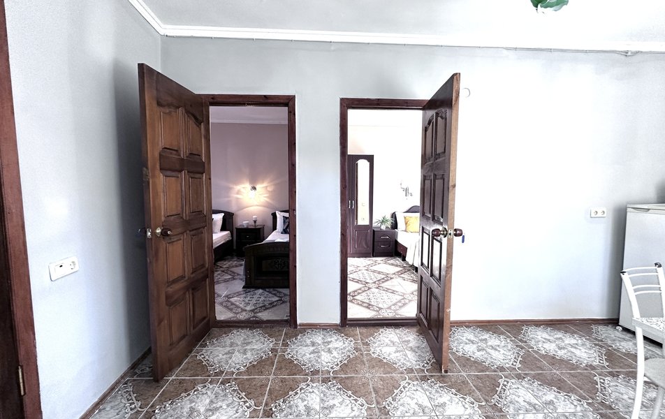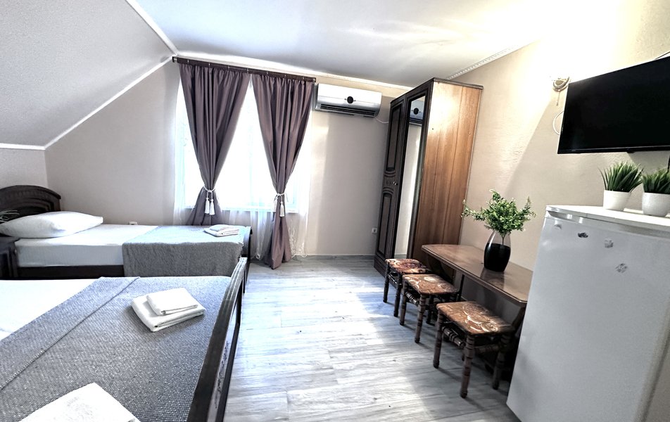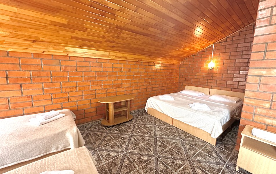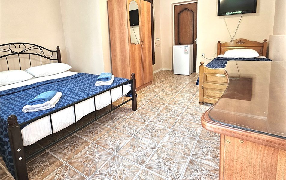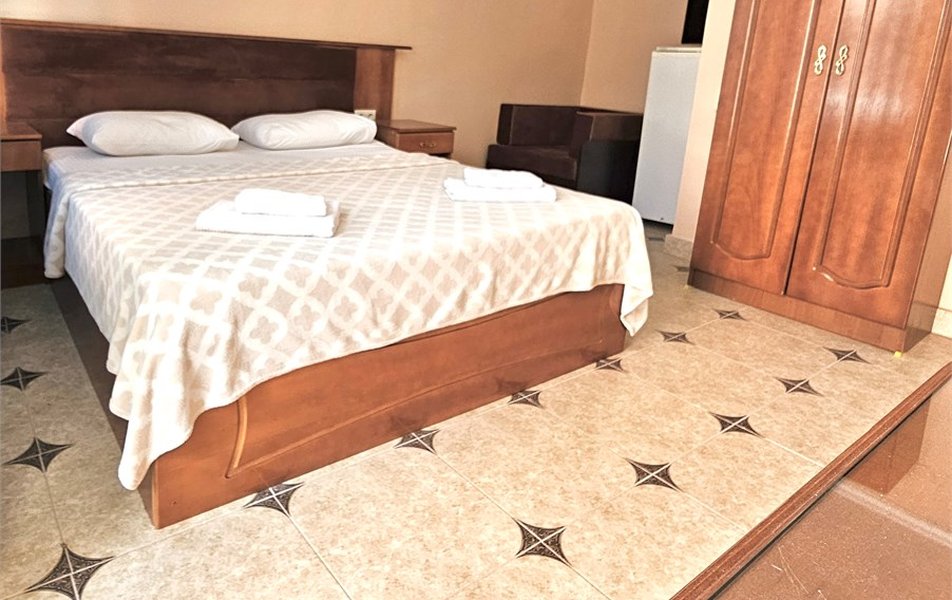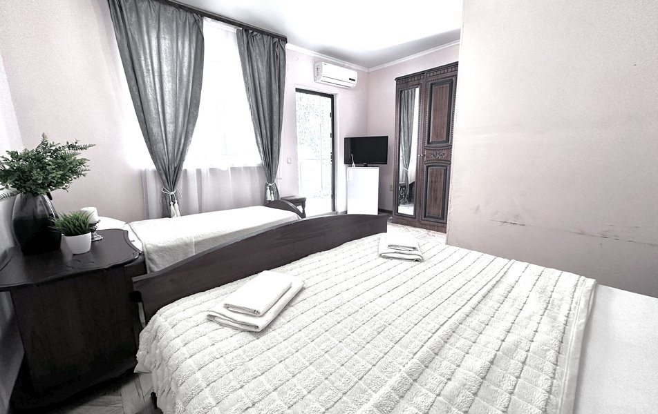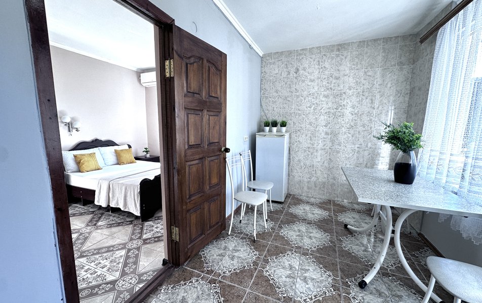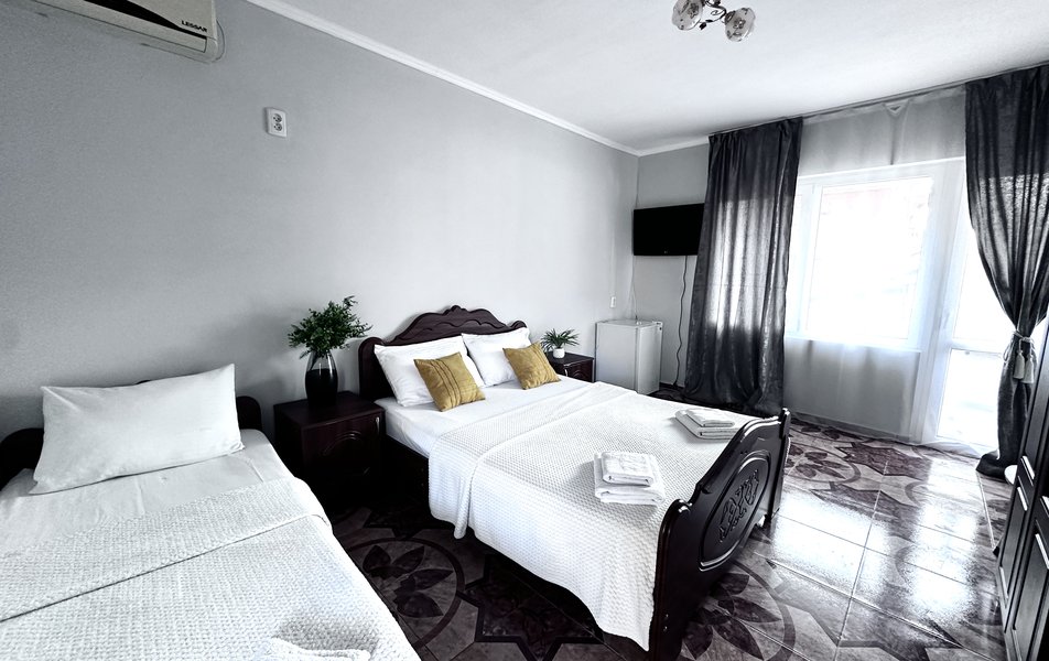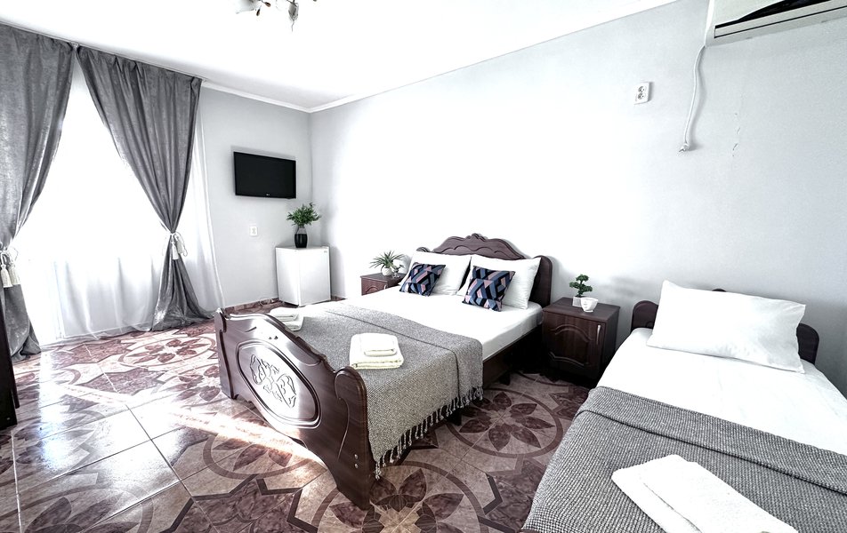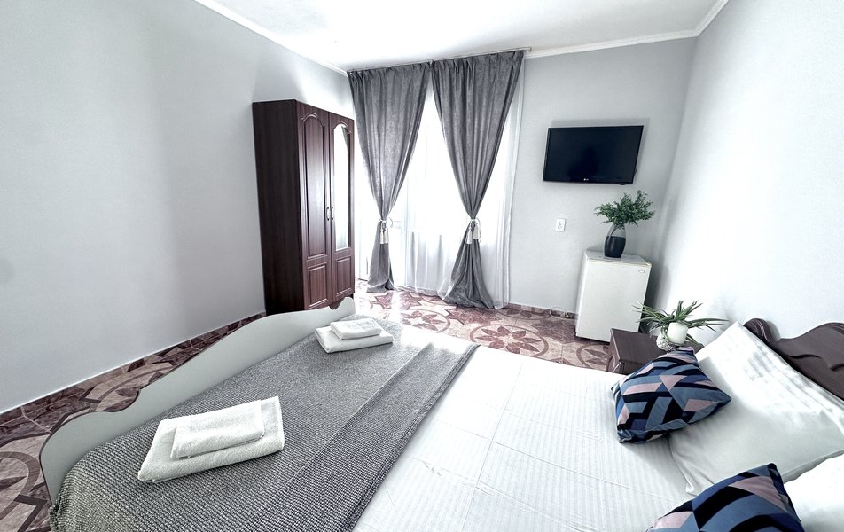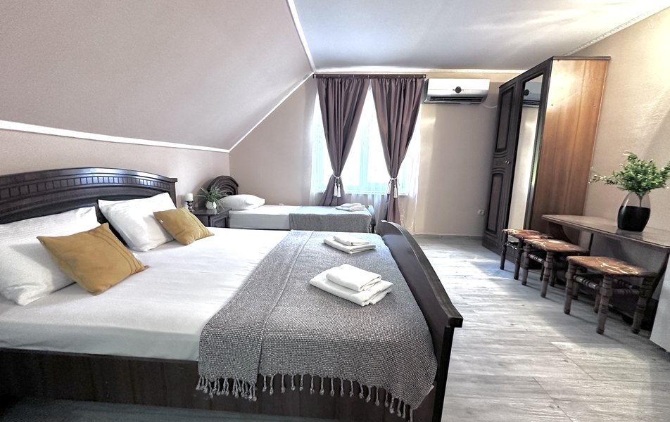 Отдыхали 2 взрослых и 2 ребёнка, на 7 ночей. Бронировали номер в коттедже, кажется семейный. Администратор приветливая и вежливая девушка. Номер просторный: при входе холл большой, стоит стол и 4 стула, так же холодильник с морозильной камерой. Далее две комнаты. В детской шкаф без полок, поэтому он был просто бесполезный. Повесить на 5 вешалок все детские вещи невозможно, поэтому шкафом в детской пользоваться не смогли. Так же есть собственный балкон, стол и два стула. В каждой комнате по телевизору, но показывает всего 3 канала, поэтому пользоваться ими к сожалению не удалось. Ремонт, конечно, старый. Прям вернулись в начало 2000ых. Свет в комнате не работал, пользовались ночником, он яркий и спасал ситуацию. Комнаты предполагалась закрывались на замки и были даже ключи от двух комнат, но по факту замки не работают. Кстати ключ от номера у нас забрала женщина в первый же день приезда, сделать копию для персонала и до конца отдыха не вернули, то есть в наше отсутствие наше жильё всегда было открыто. И самое ужасное, что во время отъезда с нас спрашивали эти ключи и НЕ верили нам, что кто-то из сотрудников забрал у нас, чтобы копию сделать, т.к. до этого их кто-то потерял. Обязательно берите с собой туалетку, мыло, половую тряпку, средство для мытья посуды, если планируете готовить и питаться самостоятельно. За неделю не меняли бельё, полотенца и не убирались. Далее по территории: она маленькая, но всё в зелени - это радует. Есть бассейн, но он холодный и глубокий. До моря минут 10-15 кто как ходит) нас не напрягала дорога. Кстати, на территории висит реклама экскурсий, ни в коем случае не берите там, нас обманули!!! Обещали поездку на 33 водопада чайные плантации купание в горной реке. По факту возили по дегустациям каньон прохладный, то есть вместо 3ех локаций отвезли только в одну! Когда мы написали этому Артёму, почему мы бронировали одну экскурсию, а получили совершенно другую, он ответил "уточню" и просто пропал. Это мошенники! Не знаю как они могли у себя на территории отеля повесить рекламу людей, которые обманывают туристов!