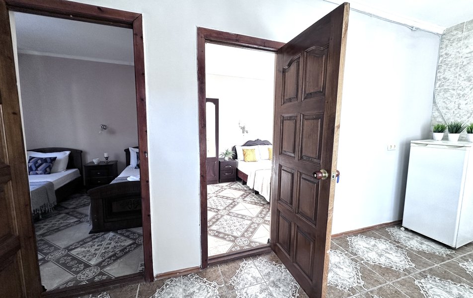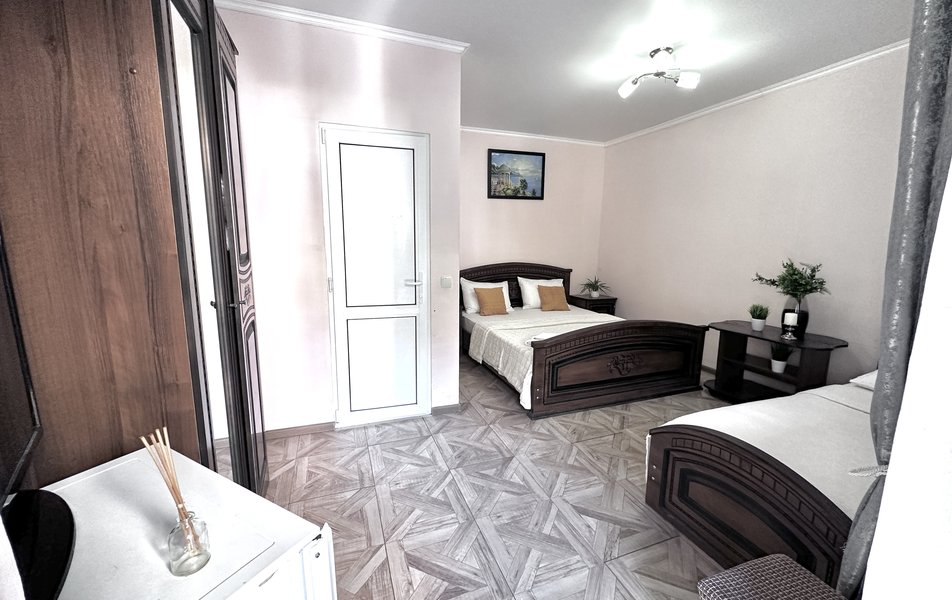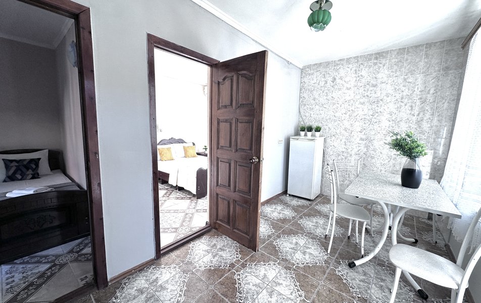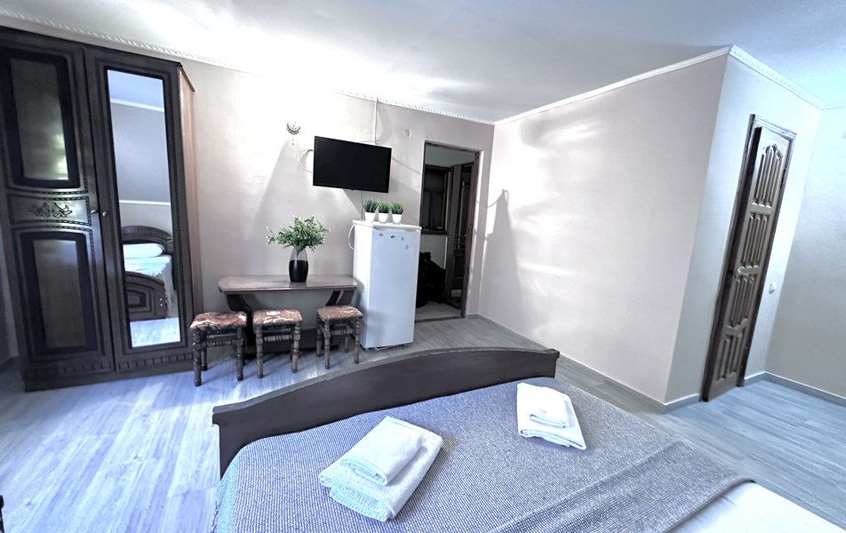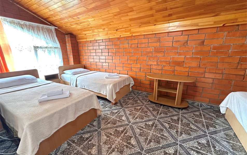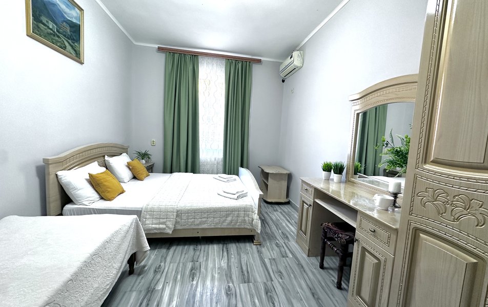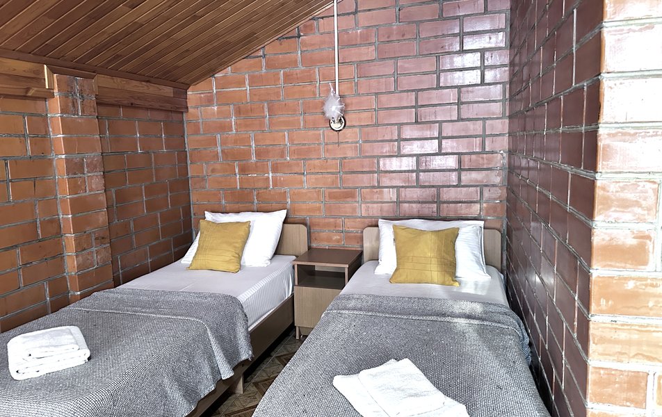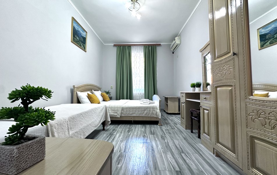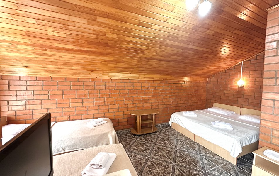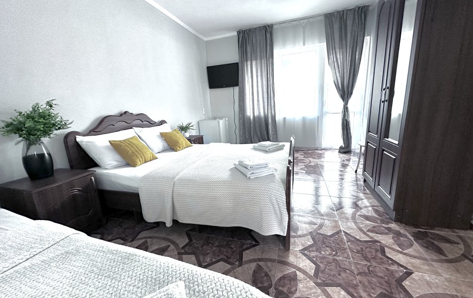 Отдыхали 2 взрослых и 2 ребёнка, на 7 ночей. Бронировали номер в коттедже, кажется семейный. Администратор приветливая и вежливая девушка. Номер просторный: при входе холл большой, стоит стол и 4 стула, так же холодильник с морозильной камерой. Далее две комнаты. В детской шкаф без полок, поэтому он был просто бесполезный. Повесить на 5 вешалок все детские вещи невозможно, поэтому шкафом в детской пользоваться не смогли. Так же есть собственный балкон, стол и два стула. В каждой комнате по телевизору, но показывает всего 3 канала, поэтому пользоваться ими к сожалению не удалось. Ремонт, конечно, старый. Прям вернулись в начало 2000ых. Свет в комнате не работал, пользовались ночником, он яркий и спасал ситуацию. Комнаты предполагалась закрывались на замки и были даже ключи от двух комнат, но по факту замки не работают. Кстати ключ от номера у нас забрала женщина в первый же день приезда, сделать копию для персонала и до конца отдыха не вернули, то есть в наше отсутствие наше жильё всегда было открыто. И самое ужасное, что во время отъезда с нас спрашивали эти ключи и НЕ верили нам, что кто-то из сотрудников забрал у нас, чтобы копию сделать, т.к. до этого их кто-то потерял. Обязательно берите с собой туалетку, мыло, половую тряпку, средство для мытья посуды, если планируете готовить и питаться самостоятельно. За неделю не меняли бельё, полотенца и не убирались. Далее по территории: она маленькая, но всё в зелени - это радует. Есть бассейн, но он холодный и глубокий. До моря минут 10-15 кто как ходит) нас не напрягала дорога. Кстати, на территории висит реклама экскурсий, ни в коем случае не берите там, нас обманули!!! Обещали поездку на 33 водопада чайные плантации купание в горной реке. По факту возили по дегустациям каньон прохладный, то есть вместо 3ех локаций отвезли только в одну! Когда мы написали этому Артёму, почему мы бронировали одну экскурсию, а получили совершенно другую, он ответил "уточню" и просто пропал. Это мошенники! Не знаю как они могли у себя на территории отеля повесить рекламу людей, которые обманывают туристов!