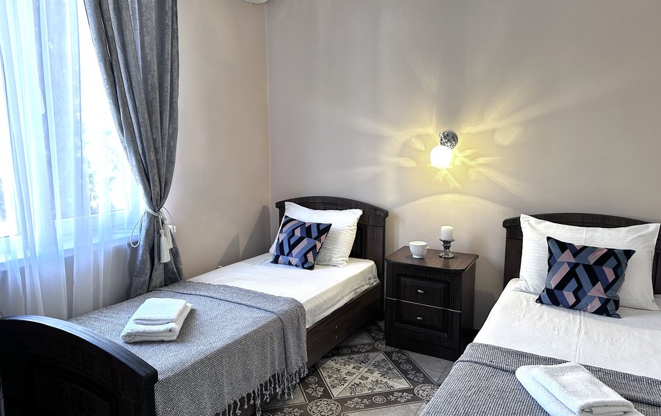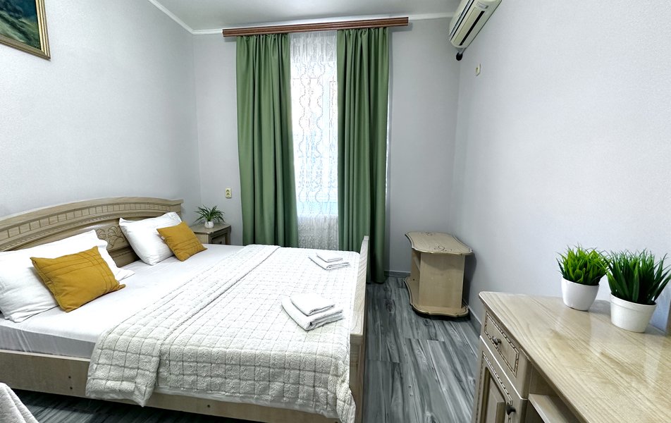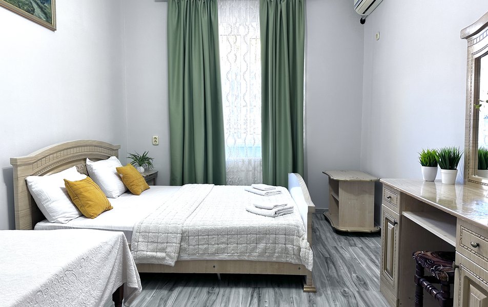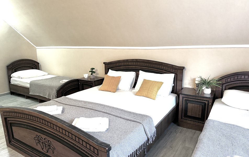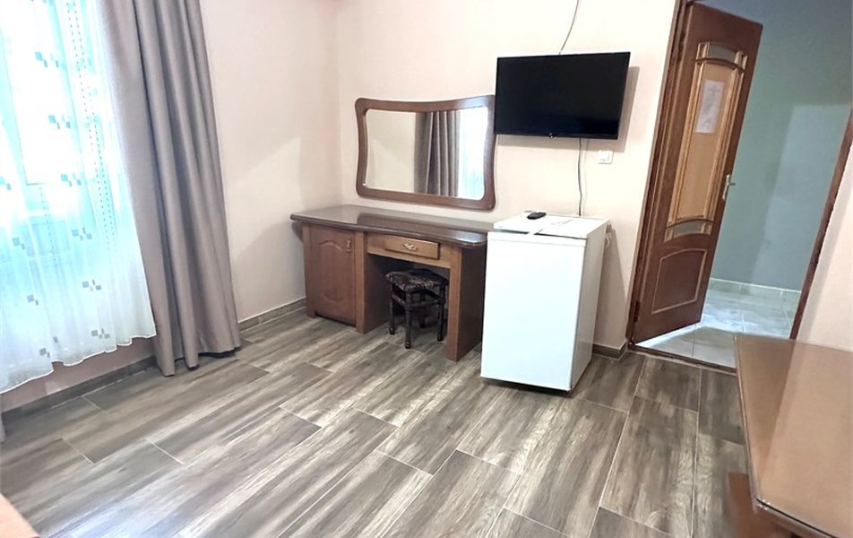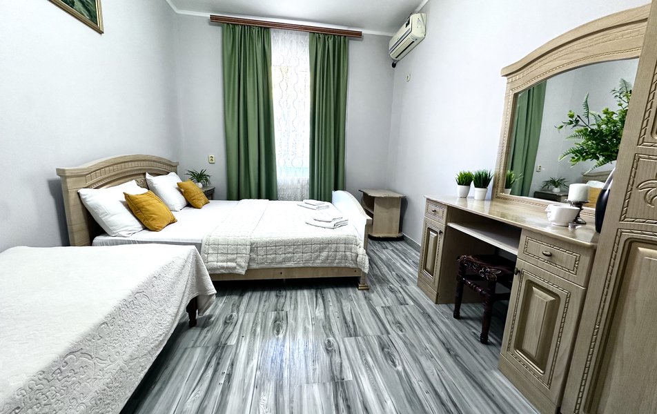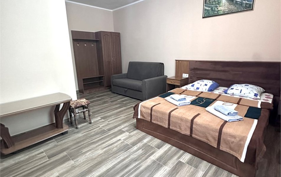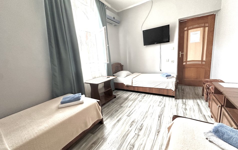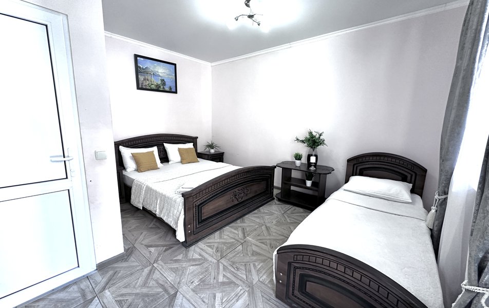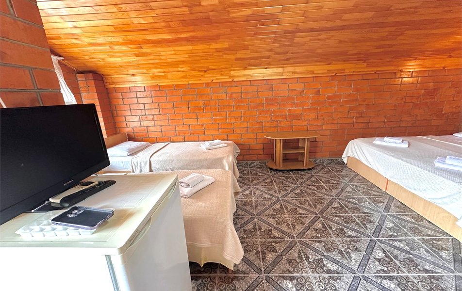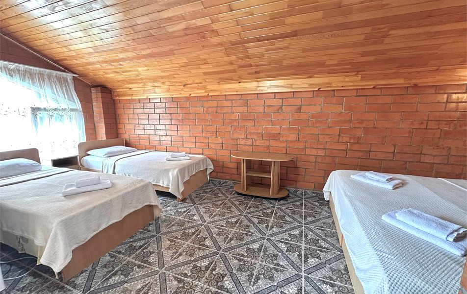 Отдыхали 2 взрослых и 2 ребёнка, на 7 ночей. Бронировали номер в коттедже, кажется семейный. Администратор приветливая и вежливая девушка. Номер просторный: при входе холл большой, стоит стол и 4 стула, так же холодильник с морозильной камерой. Далее две комнаты. В детской шкаф без полок, поэтому он был просто бесполезный. Повесить на 5 вешалок все детские вещи невозможно, поэтому шкафом в детской пользоваться не смогли. Так же есть собственный балкон, стол и два стула. В каждой комнате по телевизору, но показывает всего 3 канала, поэтому пользоваться ими к сожалению не удалось. Ремонт, конечно, старый. Прям вернулись в начало 2000ых. Свет в комнате не работал, пользовались ночником, он яркий и спасал ситуацию. Комнаты предполагалась закрывались на замки и были даже ключи от двух комнат, но по факту замки не работают. Кстати ключ от номера у нас забрала женщина в первый же день приезда, сделать копию для персонала и до конца отдыха не вернули, то есть в наше отсутствие наше жильё всегда было открыто. И самое ужасное, что во время отъезда с нас спрашивали эти ключи и НЕ верили нам, что кто-то из сотрудников забрал у нас, чтобы копию сделать, т.к. до этого их кто-то потерял. Обязательно берите с собой туалетку, мыло, половую тряпку, средство для мытья посуды, если планируете готовить и питаться самостоятельно. За неделю не меняли бельё, полотенца и не убирались. Далее по территории: она маленькая, но всё в зелени - это радует. Есть бассейн, но он холодный и глубокий. До моря минут 10-15 кто как ходит) нас не напрягала дорога. Кстати, на территории висит реклама экскурсий, ни в коем случае не берите там, нас обманули!!! Обещали поездку на 33 водопада чайные плантации купание в горной реке. По факту возили по дегустациям каньон прохладный, то есть вместо 3ех локаций отвезли только в одну! Когда мы написали этому Артёму, почему мы бронировали одну экскурсию, а получили совершенно другую, он ответил "уточню" и просто пропал. Это мошенники! Не знаю как они могли у себя на территории отеля повесить рекламу людей, которые обманывают туристов!