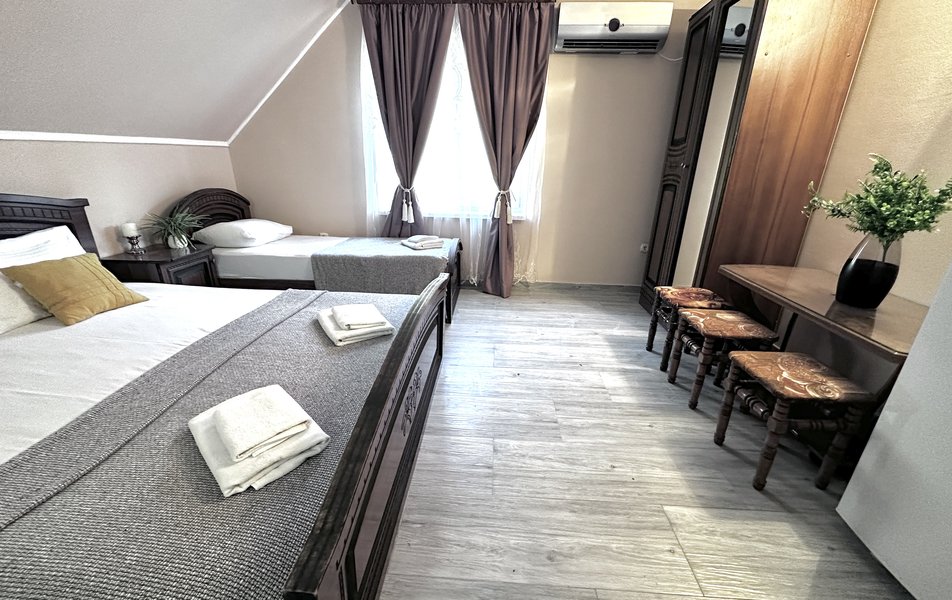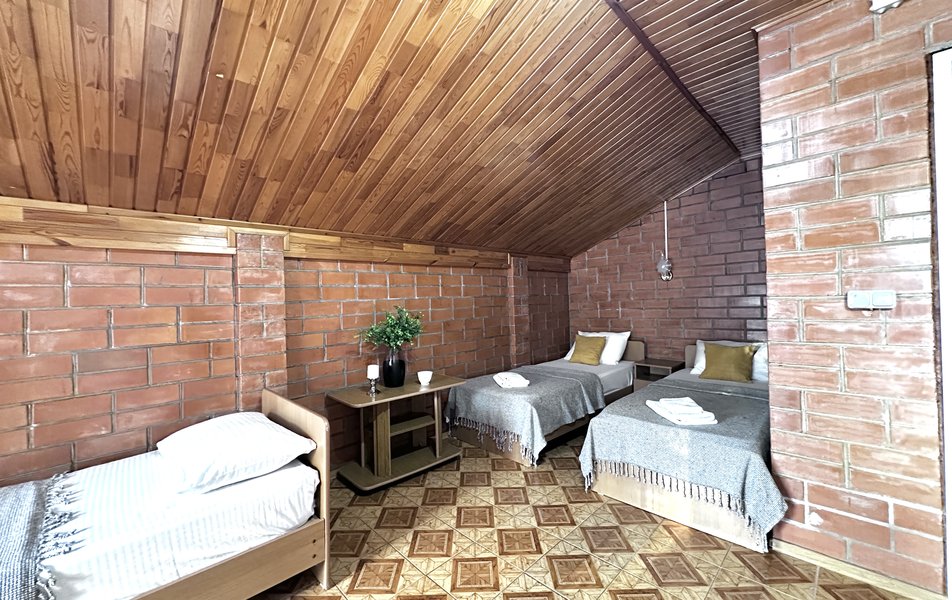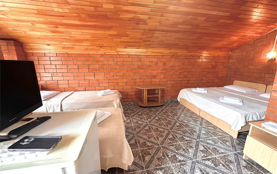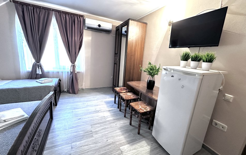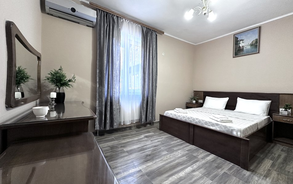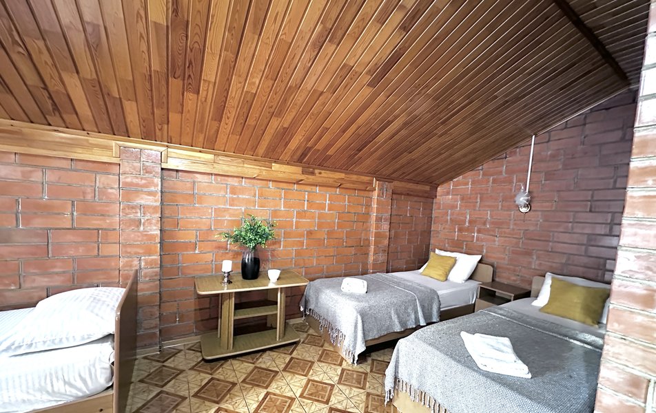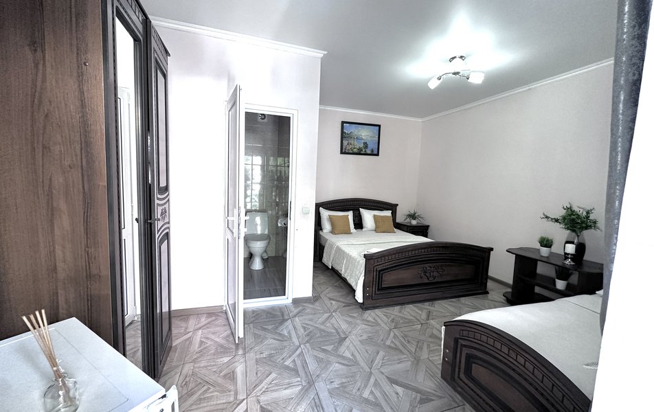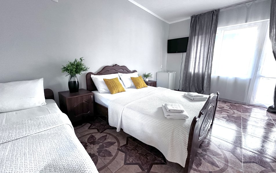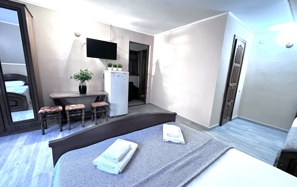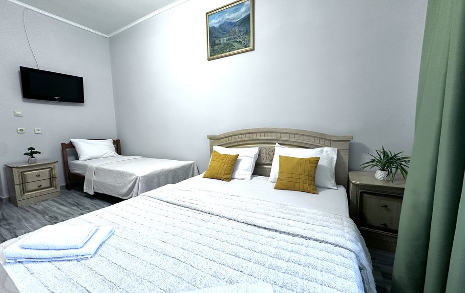 Отдыхали 2 взрослых и 2 ребёнка, на 7 ночей. Бронировали номер в коттедже, кажется семейный. Администратор приветливая и вежливая девушка. Номер просторный: при входе холл большой, стоит стол и 4 стула, так же холодильник с морозильной камерой. Далее две комнаты. В детской шкаф без полок, поэтому он был просто бесполезный. Повесить на 5 вешалок все детские вещи невозможно, поэтому шкафом в детской пользоваться не смогли. Так же есть собственный балкон, стол и два стула. В каждой комнате по телевизору, но показывает всего 3 канала, поэтому пользоваться ими к сожалению не удалось. Ремонт, конечно, старый. Прям вернулись в начало 2000ых. Свет в комнате не работал, пользовались ночником, он яркий и спасал ситуацию. Комнаты предполагалась закрывались на замки и были даже ключи от двух комнат, но по факту замки не работают. Кстати ключ от номера у нас забрала женщина в первый же день приезда, сделать копию для персонала и до конца отдыха не вернули, то есть в наше отсутствие наше жильё всегда было открыто. И самое ужасное, что во время отъезда с нас спрашивали эти ключи и НЕ верили нам, что кто-то из сотрудников забрал у нас, чтобы копию сделать, т.к. до этого их кто-то потерял. Обязательно берите с собой туалетку, мыло, половую тряпку, средство для мытья посуды, если планируете готовить и питаться самостоятельно. За неделю не меняли бельё, полотенца и не убирались. Далее по территории: она маленькая, но всё в зелени - это радует. Есть бассейн, но он холодный и глубокий. До моря минут 10-15 кто как ходит) нас не напрягала дорога. Кстати, на территории висит реклама экскурсий, ни в коем случае не берите там, нас обманули!!! Обещали поездку на 33 водопада чайные плантации купание в горной реке. По факту возили по дегустациям каньон прохладный, то есть вместо 3ех локаций отвезли только в одну! Когда мы написали этому Артёму, почему мы бронировали одну экскурсию, а получили совершенно другую, он ответил "уточню" и просто пропал. Это мошенники! Не знаю как они могли у себя на территории отеля повесить рекламу людей, которые обманывают туристов!