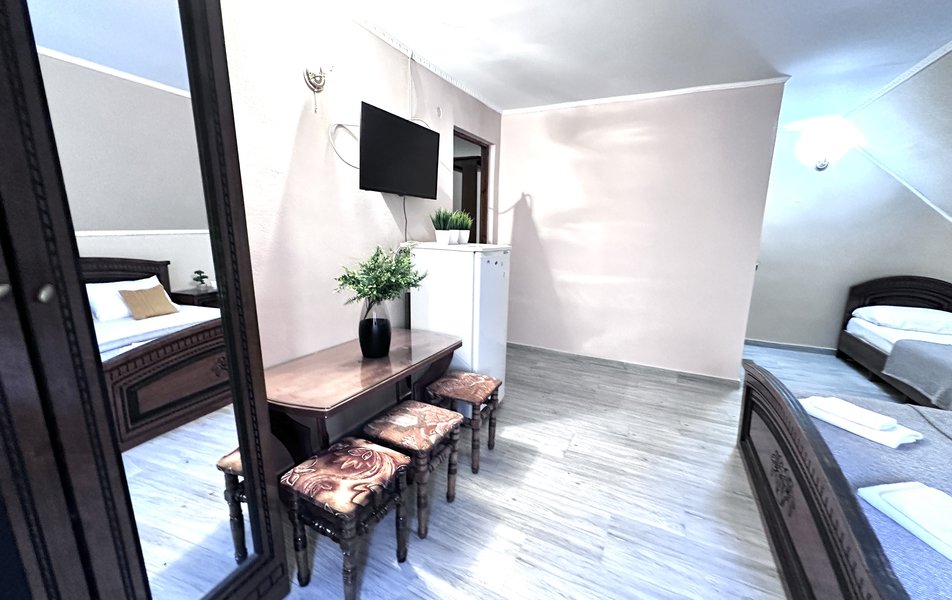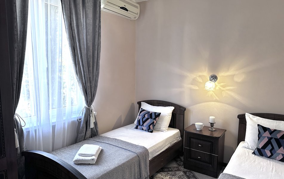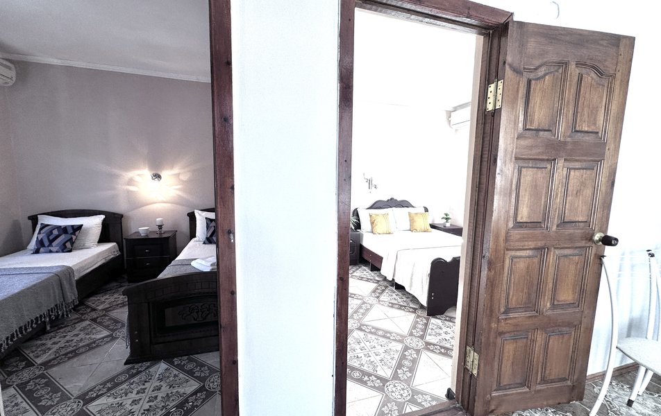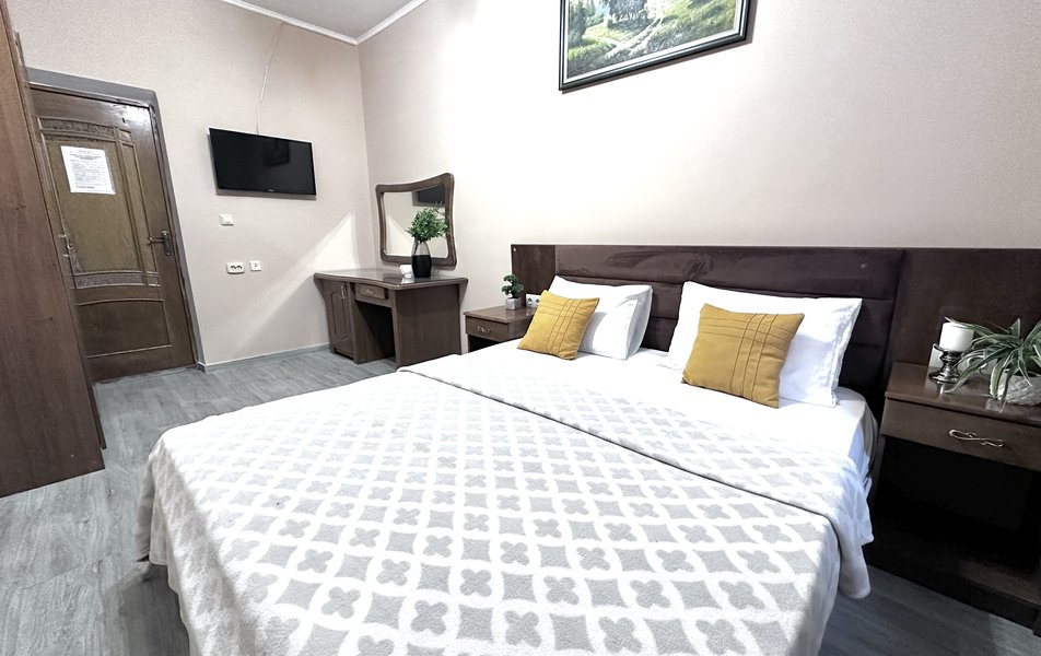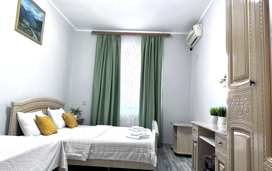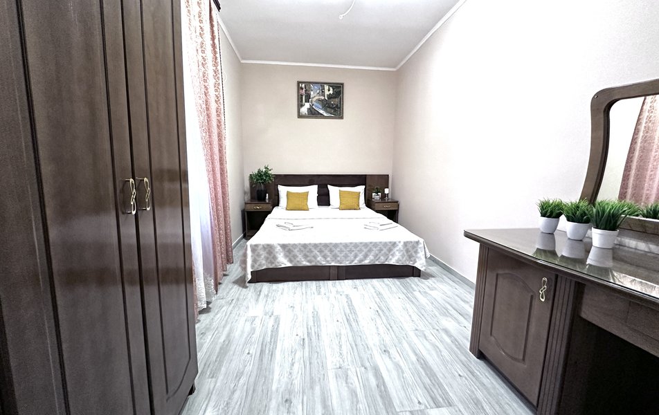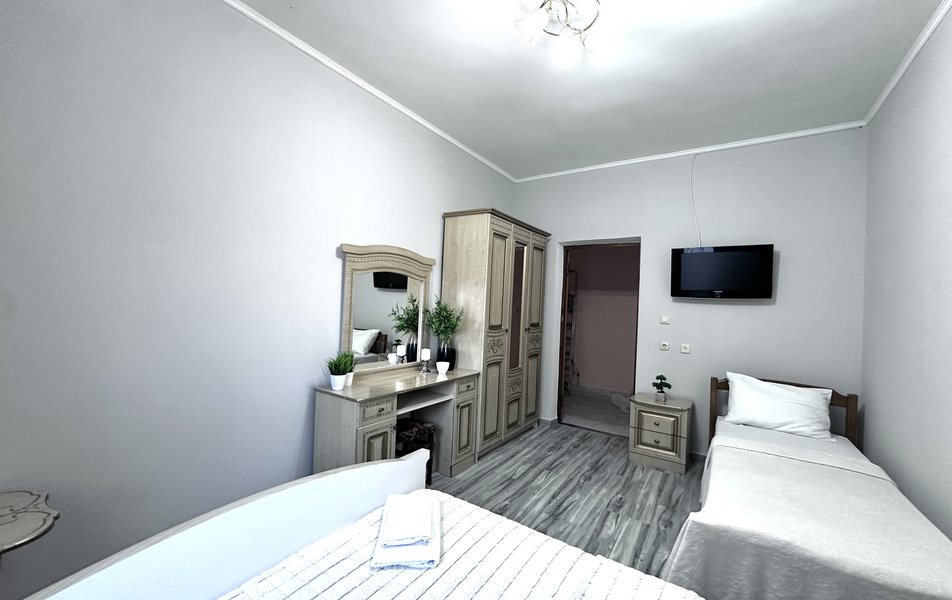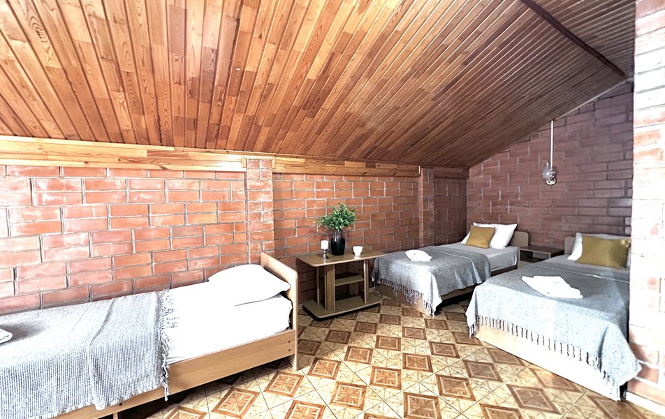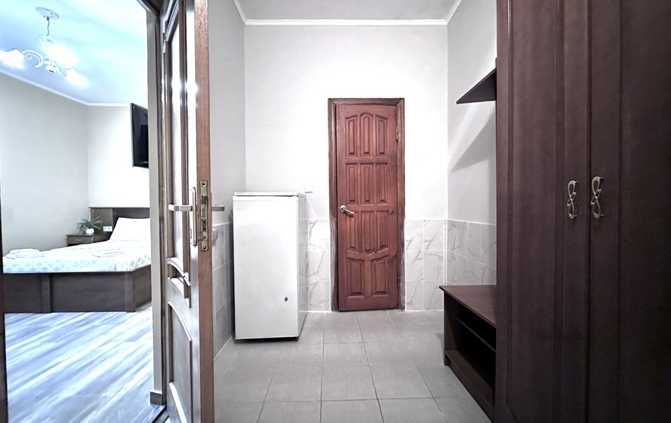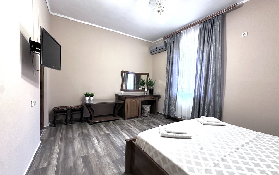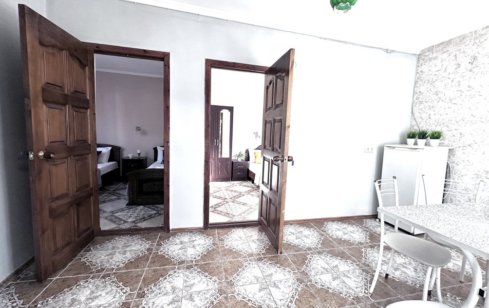 Отдыхали 2 взрослых и 2 ребёнка, на 7 ночей. Бронировали номер в коттедже, кажется семейный. Администратор приветливая и вежливая девушка. Номер просторный: при входе холл большой, стоит стол и 4 стула, так же холодильник с морозильной камерой. Далее две комнаты. В детской шкаф без полок, поэтому он был просто бесполезный. Повесить на 5 вешалок все детские вещи невозможно, поэтому шкафом в детской пользоваться не смогли. Так же есть собственный балкон, стол и два стула. В каждой комнате по телевизору, но показывает всего 3 канала, поэтому пользоваться ими к сожалению не удалось. Ремонт, конечно, старый. Прям вернулись в начало 2000ых. Свет в комнате не работал, пользовались ночником, он яркий и спасал ситуацию. Комнаты предполагалась закрывались на замки и были даже ключи от двух комнат, но по факту замки не работают. Кстати ключ от номера у нас забрала женщина в первый же день приезда, сделать копию для персонала и до конца отдыха не вернули, то есть в наше отсутствие наше жильё всегда было открыто. И самое ужасное, что во время отъезда с нас спрашивали эти ключи и НЕ верили нам, что кто-то из сотрудников забрал у нас, чтобы копию сделать, т.к. до этого их кто-то потерял. Обязательно берите с собой туалетку, мыло, половую тряпку, средство для мытья посуды, если планируете готовить и питаться самостоятельно. За неделю не меняли бельё, полотенца и не убирались. Далее по территории: она маленькая, но всё в зелени - это радует. Есть бассейн, но он холодный и глубокий. До моря минут 10-15 кто как ходит) нас не напрягала дорога. Кстати, на территории висит реклама экскурсий, ни в коем случае не берите там, нас обманули!!! Обещали поездку на 33 водопада чайные плантации купание в горной реке. По факту возили по дегустациям каньон прохладный, то есть вместо 3ех локаций отвезли только в одну! Когда мы написали этому Артёму, почему мы бронировали одну экскурсию, а получили совершенно другую, он ответил "уточню" и просто пропал. Это мошенники! Не знаю как они могли у себя на территории отеля повесить рекламу людей, которые обманывают туристов!