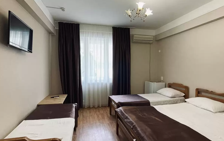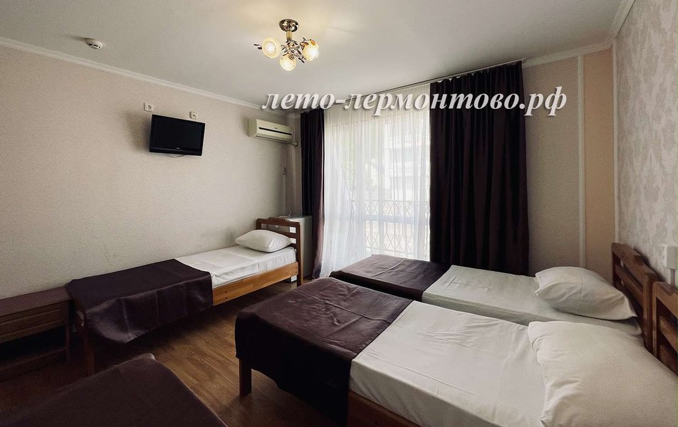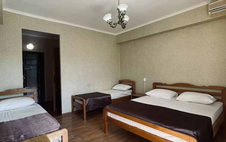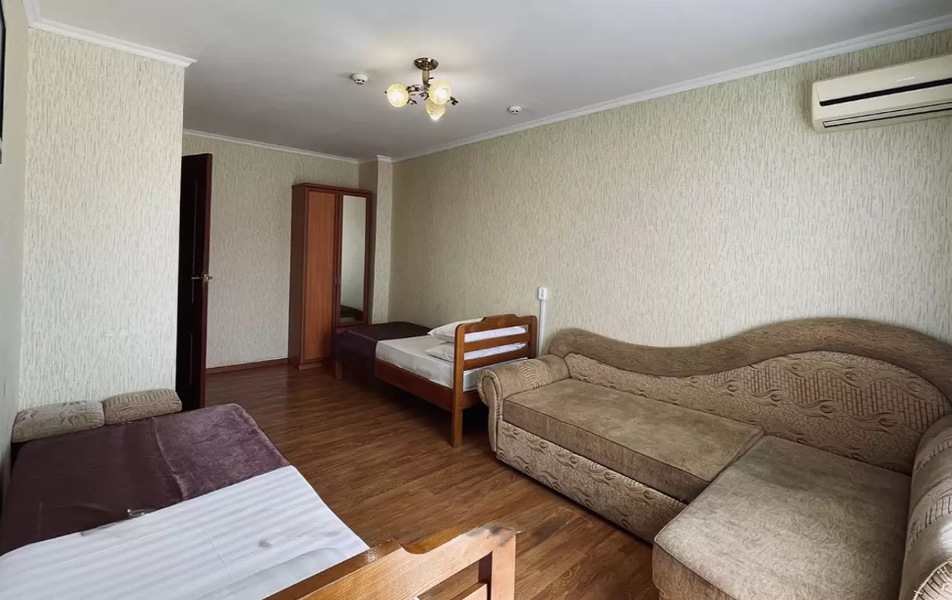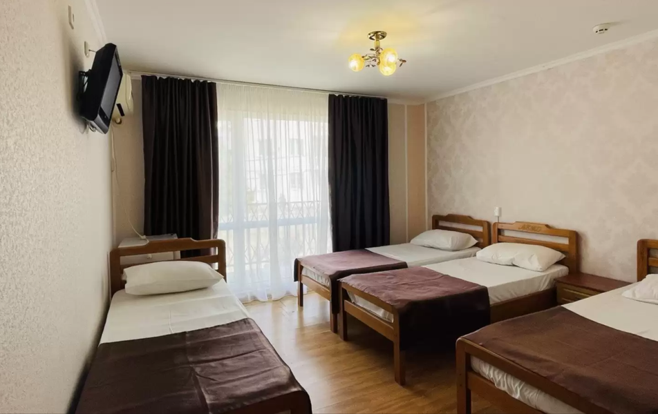 Стандартный 4-местный Количество комнат: 1-комнатный Тип номера: Стандартный Кол-во основных мест: 4 Балкон: не во всех номерах, с мебелью Мебель: вешалка, зеркало, кровати односпальные, кровать двуспальная/ две полутороспальные кровати, прикроватные тумбочки, шкаф Оборудование: кондиционер, телевизор, холодильник Санузел: с душем, туалетные принадлежности Сервис: Wi-Fi бесплатно, смена полотенец, смена постельного белья, уборка номера