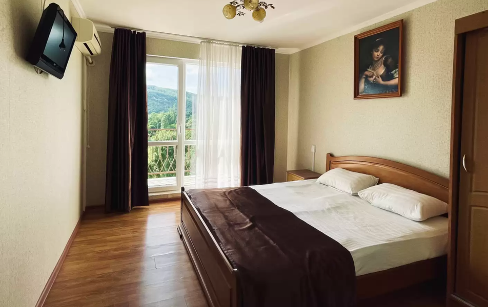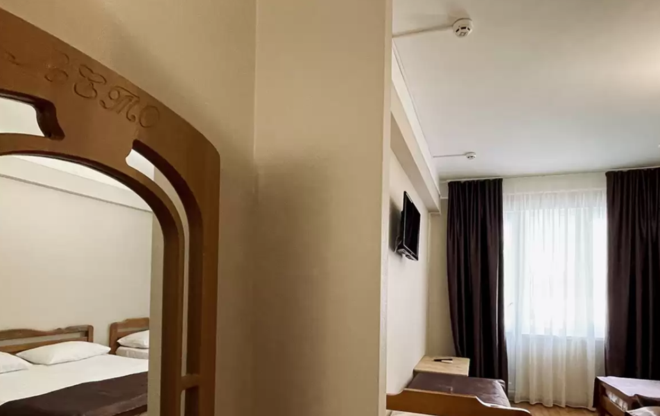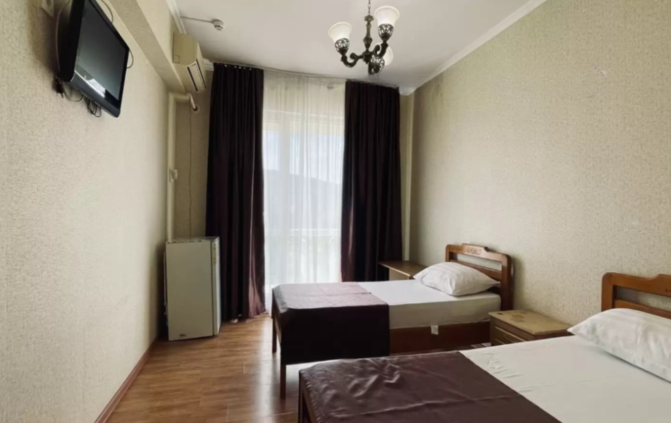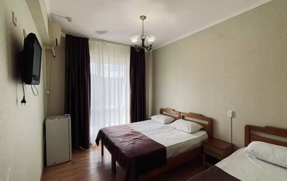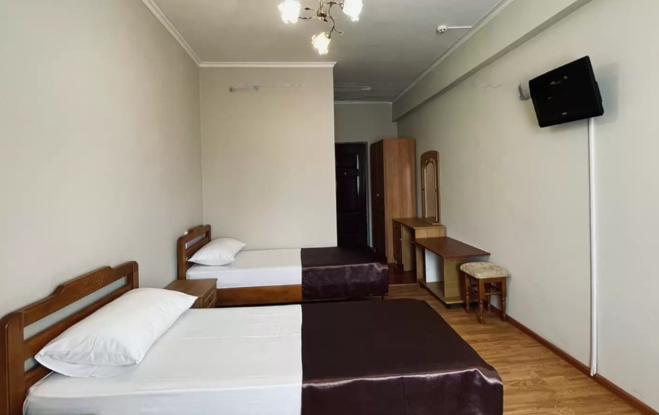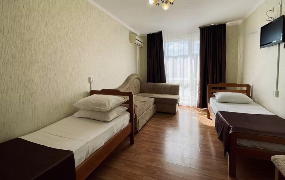 Стандартный 4-местный Количество комнат: 1-комнатный Тип номера: Стандартный Кол-во основных мест: 4 Балкон: не во всех номерах, с мебелью Мебель: вешалка, зеркало, кровати односпальные, кровать двуспальная/ две полутороспальные кровати, прикроватные тумбочки, шкаф Оборудование: кондиционер, телевизор, холодильник Санузел: с душем, туалетные принадлежности Сервис: Wi-Fi бесплатно, смена полотенец, смена постельного белья, уборка номера