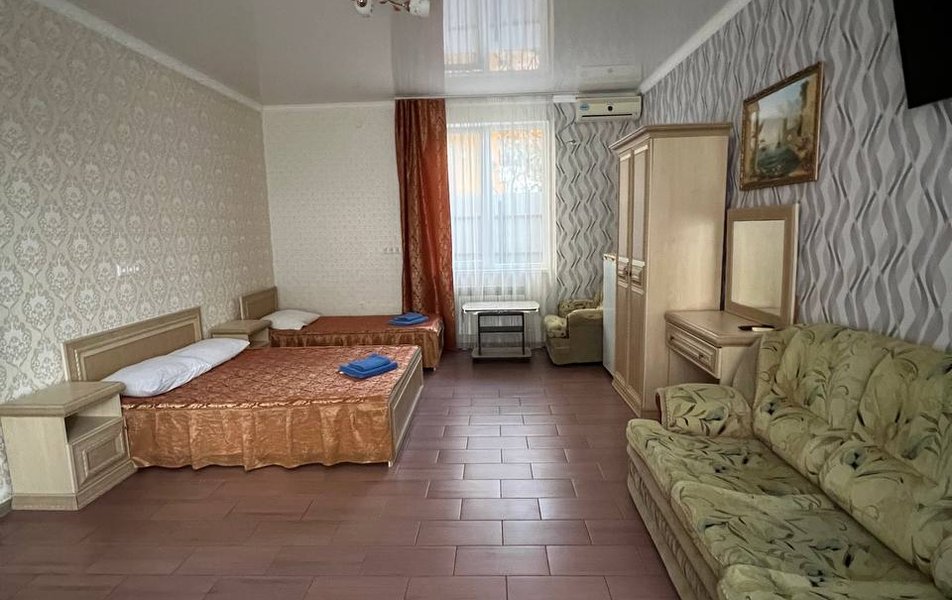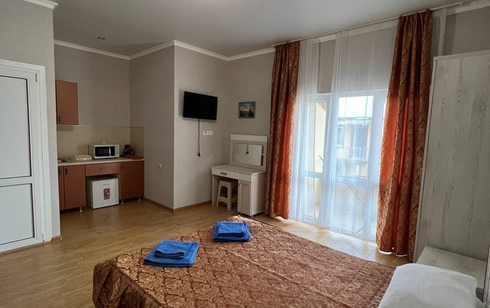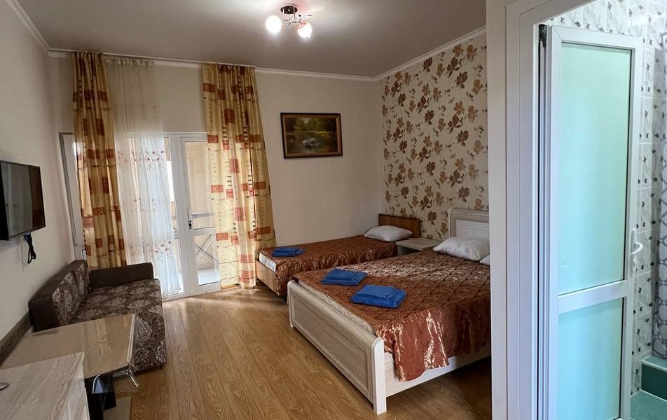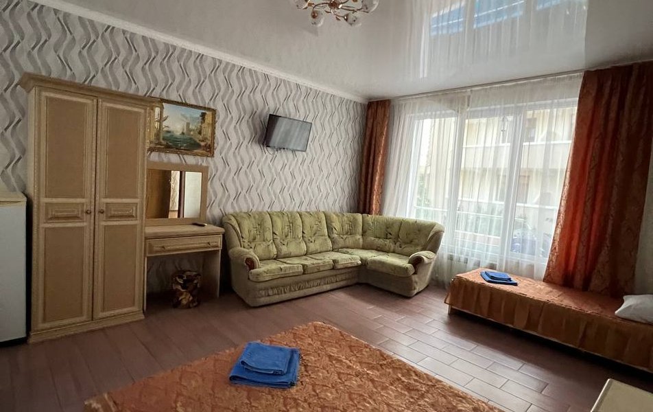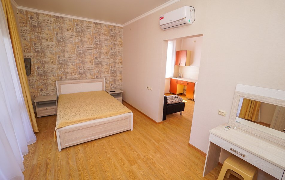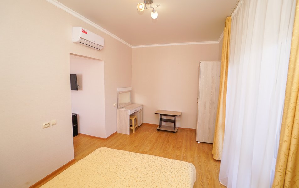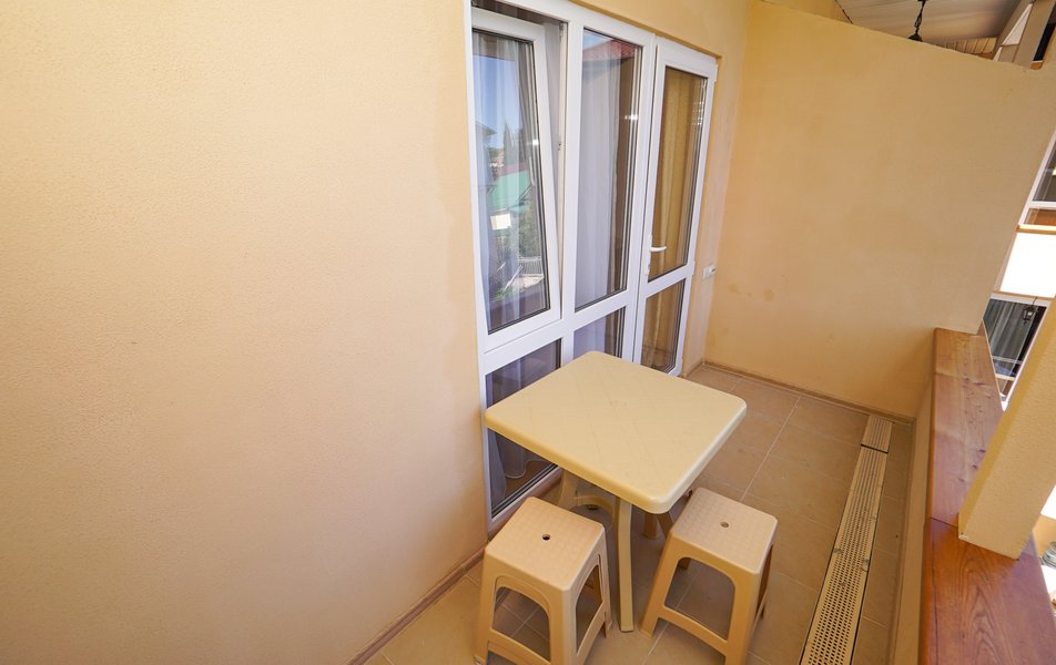 Люкс 4-местный 2-комнатный Количество комнат: 2-комнатный Тип номера: Люкс Вид из номера: частичный вид на море: на бассейн Кол-во номеров: 1 Кол-во основных мест: 4 Корпус: 1 Площадь (кв. м): 30 Балкон: с мебелью и сушилкой Мебель: диван раскладной: как основное место, зеркало, кровать двуспальная, прикроватные тумбочки, стол, стулья, шкаф Оборудование: кондиционер, телевизор, холодильник, чайный набор посуды Санузел: с душем Сервис: Wi-Fi бесплатно, room-сервис: 24 часа, смена постельного белья: 1 раз в 7 дней, уборка номера: 1 раз в 7 дней