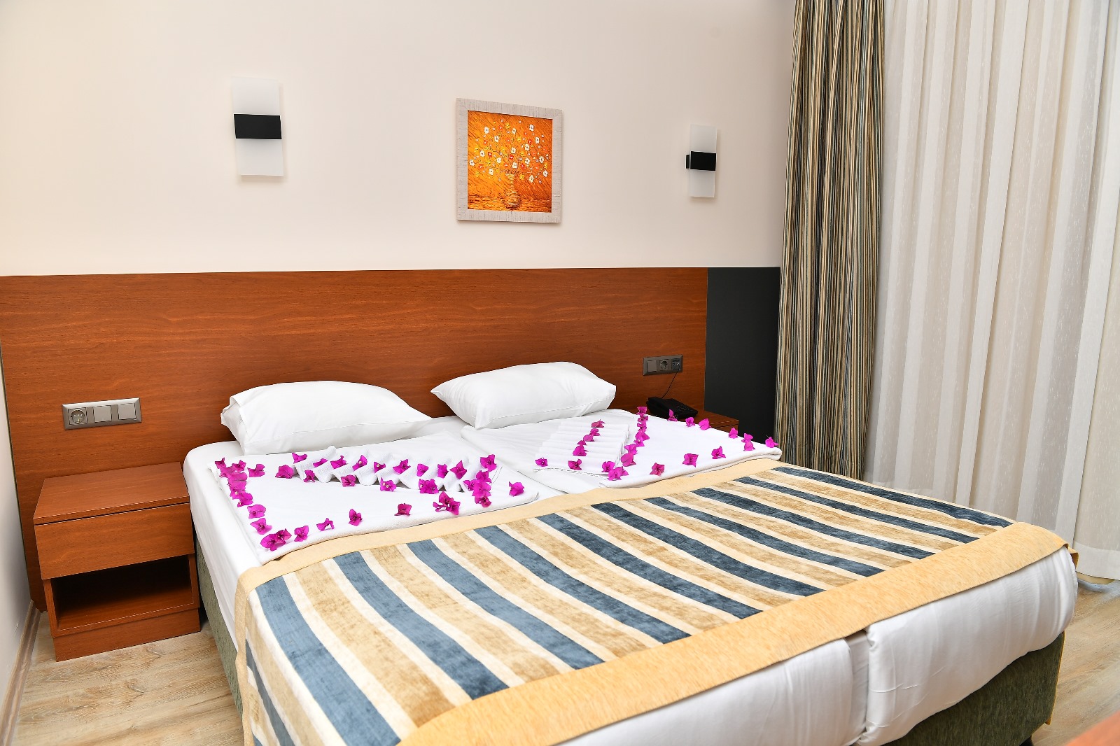 Отдыхали с 6 по 13 июля 2025 года. Из плюсов это отличные номера, свежий ремонт комнат и сан узлов, в других отелях где была реставрация, почему то сан узлы не реставрировали. Номер был с большим балконом, с видом на соседний отель и горы. Уборка, смена полотенцев, пополнение запасов шампуня и мыла производилась каждый день. Зубные щётки и пасту берите с собой, их тут не дают, мы купили в соседнем магазине. Питание хорошее, всегда было что выбрать на шведском столе, салаты повторились, но основные блюда были разные. Так же была курица и рыба - очень понравилась, мясо в различных вариациях, соусы, овощи, фрукты, чай, кофе, много вкусняшех на десерт (пахлава, если успевали урвать). Мороженое 3 евро.. Отдельный пляж хороший с трансфером из отеля, все по расписанию, в основном ходили пешком, всего 15 минут и ты на пляже. Из бассеина выгоняют в 18:30, что печально, ведь когда обойдёшь весь город или приедешь с экскурсии вечером хочется поваляться в бассеине, а тут уже облом. Но бар рядом работает до 23, так что тягали от туда вино и колу.) Wifi бесплатный есть в лобби, в номерах за отдельную плату. Сейф платный. По телику ТНТ и ещё пару каналов есть на русском. Рядом улица с барами и ресторанами, которая идёт до самого центра, всегда найдёте чем заняться и затариться вещами и продуктами если что-то необходимо. Буквально в ста метров от отеля находится туроператор Ginzu тревел, огромное спасибо Ибрагиму, всегда рекомендовал, то что лучше в данный день, т.к. сейчас пик сезона). В общем нам все понравилось, будем возвращаться снова)